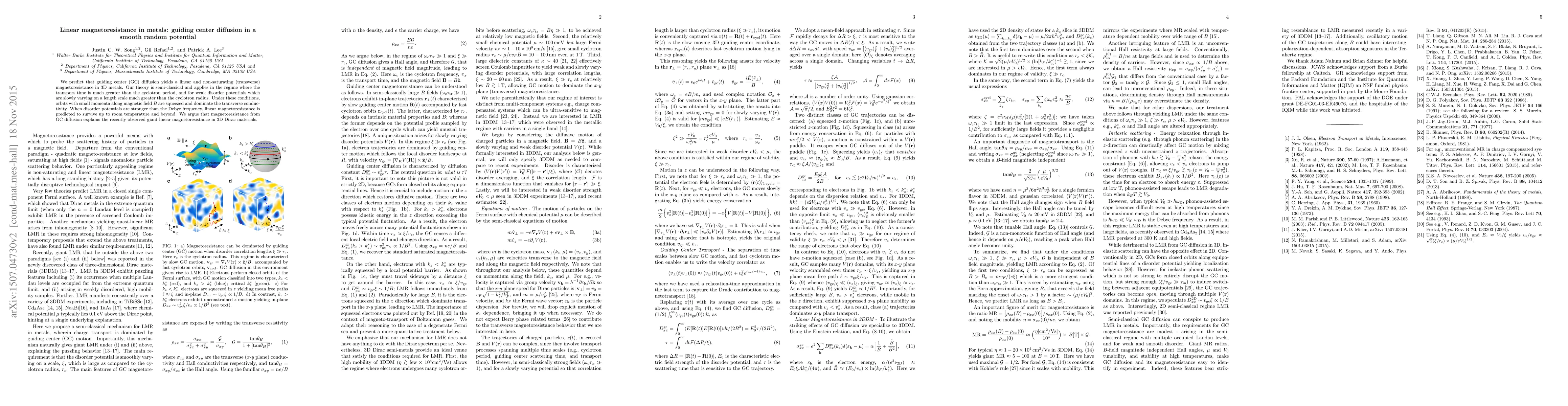This paper proposes that guiding center diffusion in 3D metals leads to linear magnetoresistance, especially in weak, smoothly varying disorder potentials. The theory suggests that this effect can persist up to room temperature and explains the observed giant linear magnetoresistance in 3D Dirac materials.