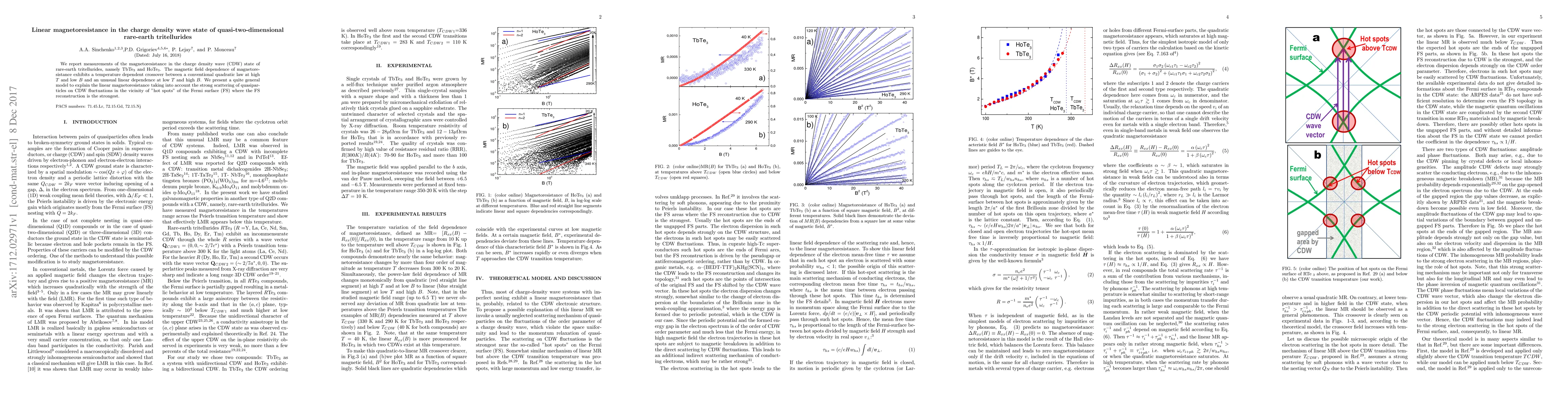 We report measurements of the magnetoresistance in the charge density wave (CDW) state of rare-earth tritellurides, namely TbTe$_3$ and HoTe$_3$. The magnetic field dependence of magnetoresistance exhibits a temperature dependent crossover between a conventional quadratic law at high $T$ and low $B$ and an unusual linear dependence at low $T$ and high $B$. We present a quite general model to explain the linear magnetoresistance taking into account the strong scattering of quasiparticles on CDW fluctuations in the vicinity of "hot spots" of the Fermi surface (FS) where the FS reconstruction is the strongest.