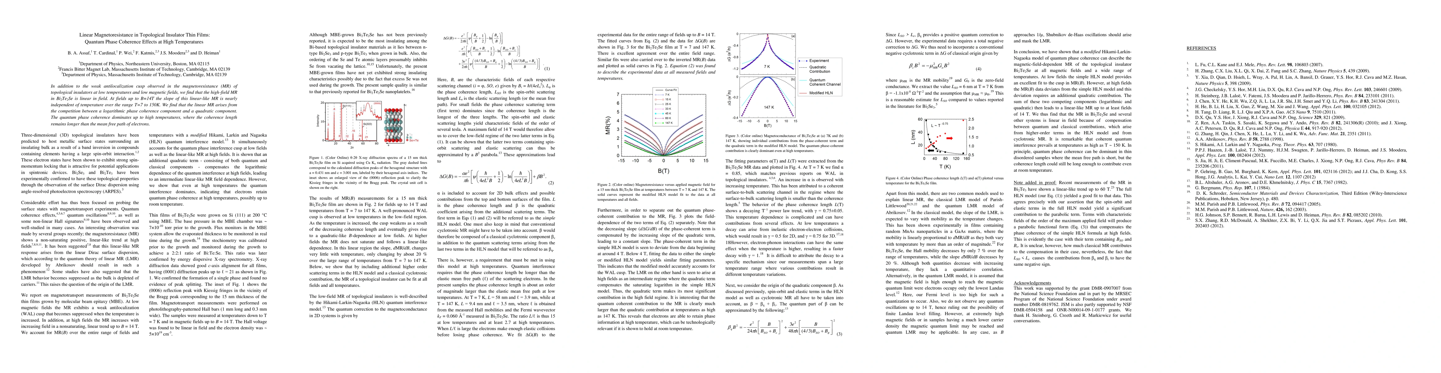 In addition to the weak antilocalization cusp observed in the magnetoresistance (MR) of topological insulators at low temperatures and low magnetic fields, we find that the high-field MR in Bi2Te2Se is linear in field. At fields up to B=14T the slope of this linear-like MR is nearly independent of temperature over the range T=7 to 150K. We find that the linear MR arises from the competition between a logarithmic phase coherence component and a quadratic component. The quantum phase coherence dominates up to high temperatures, where the coherence length remains longer than the mean free path of electrons.