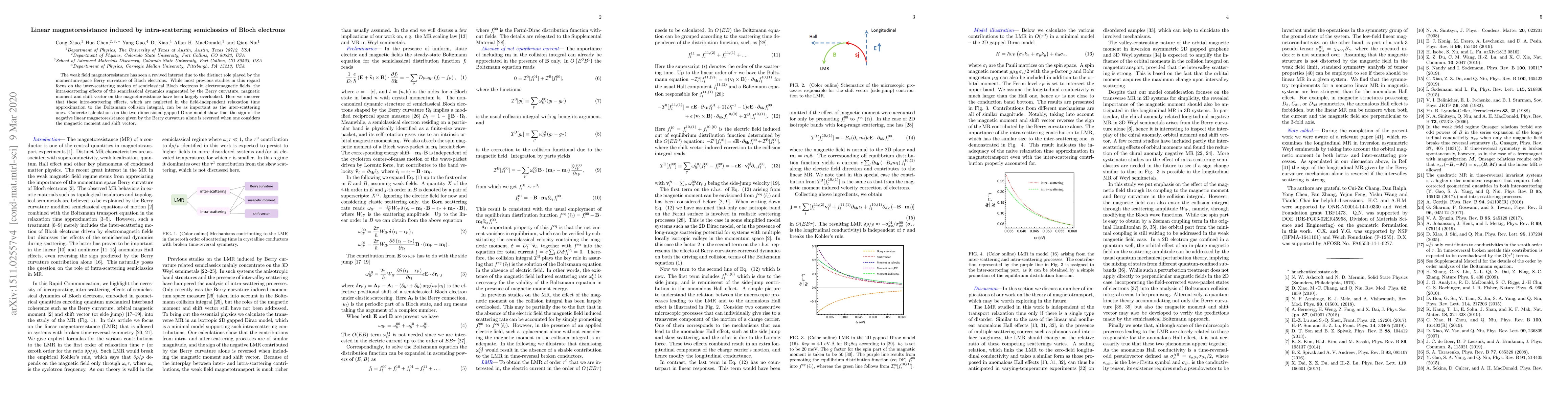 This paper investigates the linear magnetoresistance in the presence of intra-scattering effects of Bloch electrons, revealing that these effects, often neglected, can be as significant as inter-scattering. Calculations on a 2D Dirac model demonstrate that the sign of the magnetoresistance can reverse when considering the magnetic moment and shift vector alongside the Berry curvature.