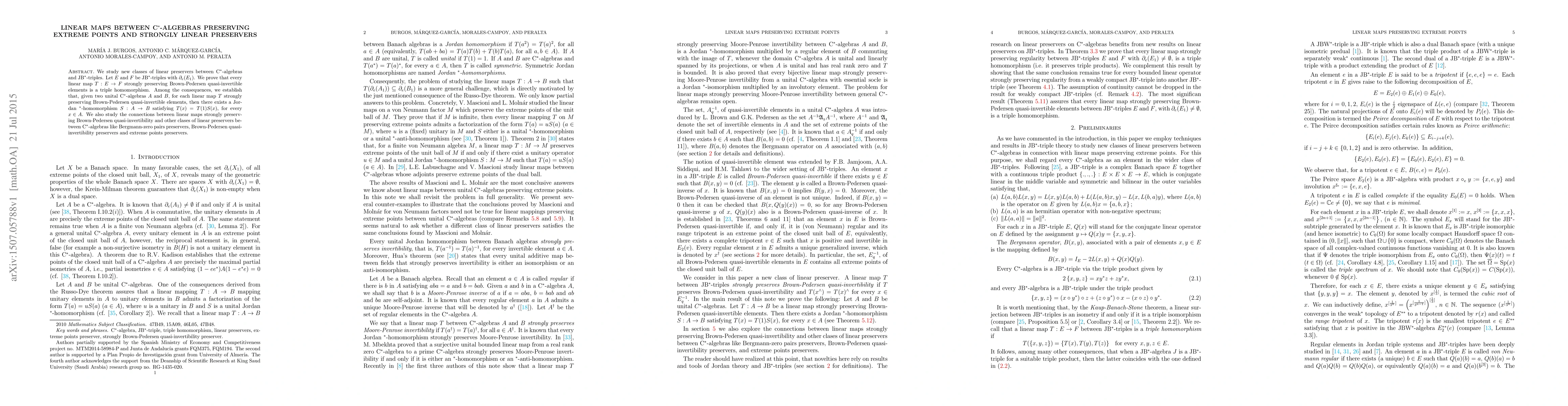 We study new classes of linear preservers between C$^*$-algebras and JB$^*$-triples. Let $E$ and $F$ be JB$^*$-triples with $\partial_{e} (E_1)$. We prove that every linear map $T:E\to F$ strongly preserving Brown-Pedersen quasi-invertible elements is a triple homomorphism. Among the consequences, we establish that, given two unital C$^*$-algebras $A$ and $B,$ for each linear map $T$ strongly preserving Brown-Pedersen quasi-invertible elements, then there exists a Jordan $^*$-homomorphism $S: A\to B$ satisfying $T(x) = T(1) S(x)$, for every $x\in A$. We also study the connections between linear maps strongly preserving Brown-Pedersen quasi-invertibility and other clases of linear preservers between C$^*$-algebras like Bergmann-zero pairs preservers, Brown-Pedersen quasi-invertibility preservers and extreme points preservers.