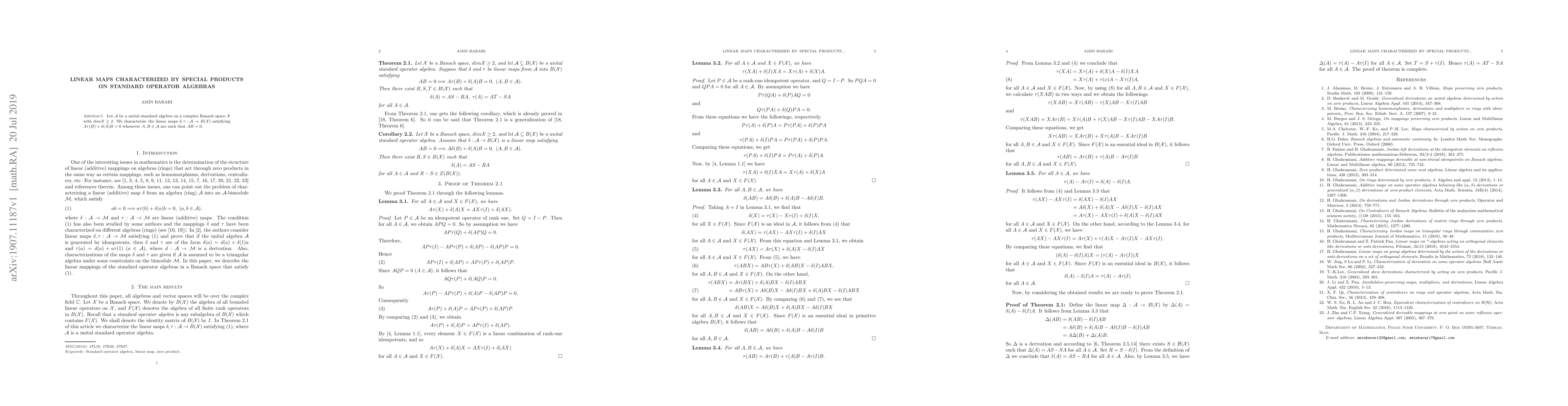 Let A be a unital standard algebra on a complex Banach space X with dimX >1. We characterize the linear maps D; T : A --> B(X) satisfying aT(b) + D(a)b= 0 whenever a,b in A are such that ab = 0.