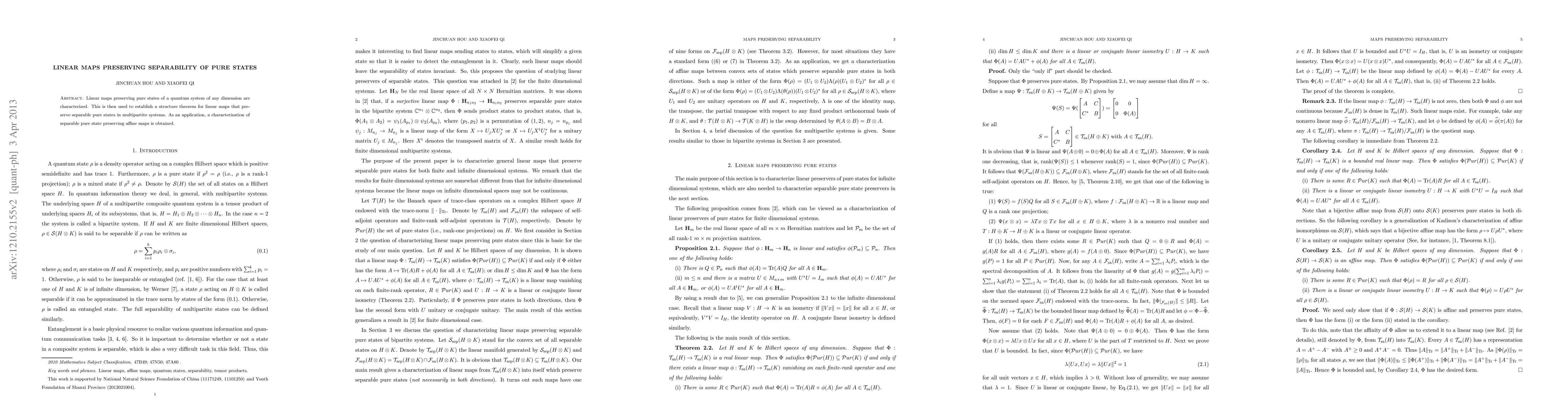 This paper characterizes linear maps that preserve pure states in quantum systems and establishes a structure theorem for those that preserve separable pure states in multipartite systems. An application includes a characterization of affine maps that preserve separable pure states.