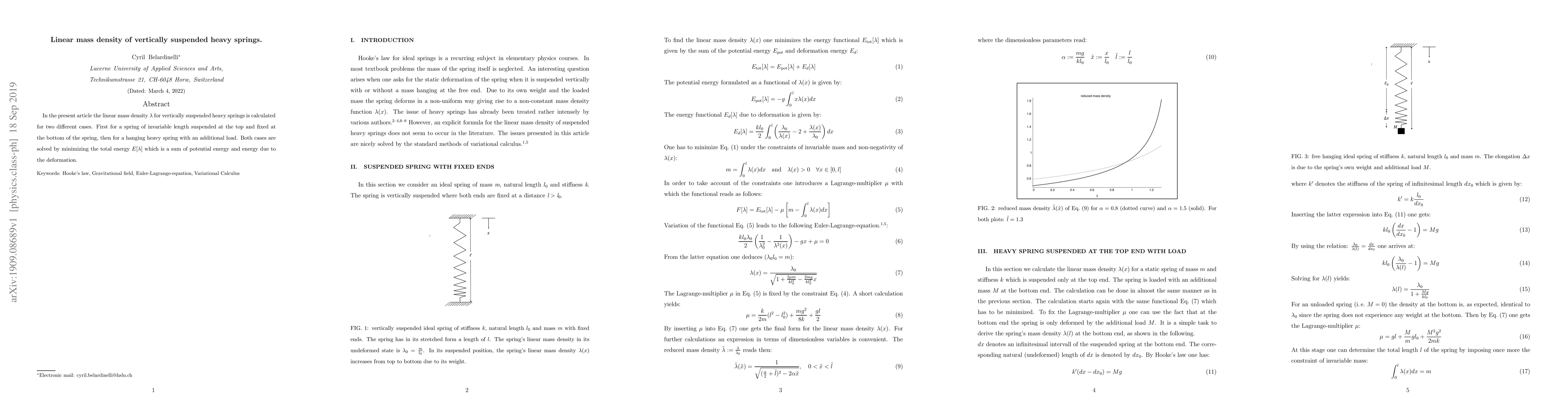In the present article the linear mass Density for vertically suspended heavy springs is calculated for two different cases. First for a spring of invariable length suspended at the top and fixed at the bottom of the spring, then for a hanging heavy spring with an additional load. Both cases are solved by minimizing the total energy which is a sum of potential energy and energy due to the deformation.