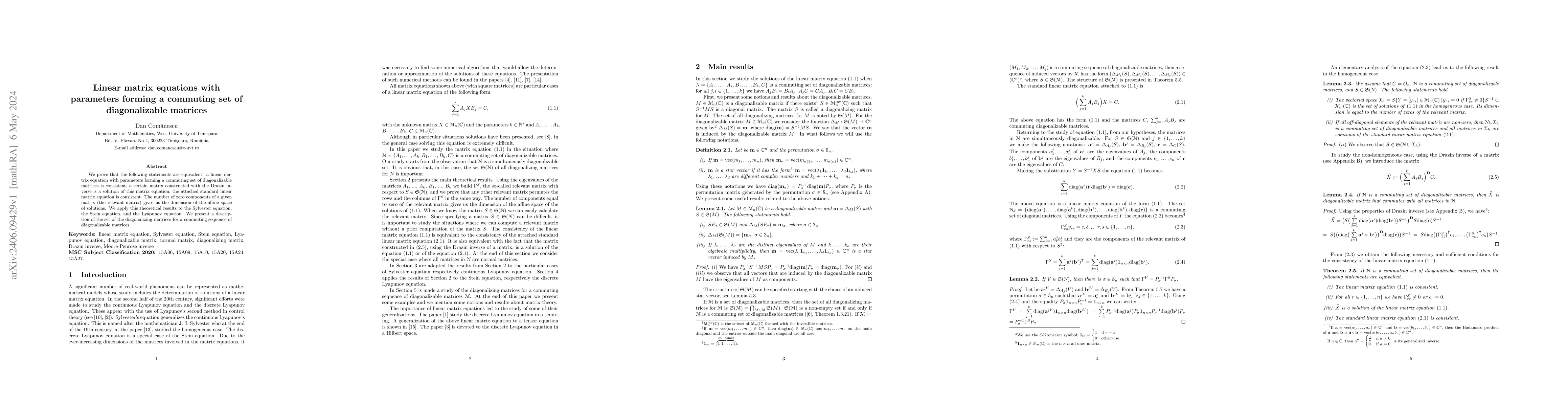 Summary: The paper establishes equivalences for linear matrix equations with commuting diagonalizable matrices, proving that consistency of such equations relates to solutions using the Drazin inverse, and applying these results to specific matrix equations like Sylvester, Stein, and Lyapunov. The number of zero components in a relevant matrix determines the dimension of the solution space.