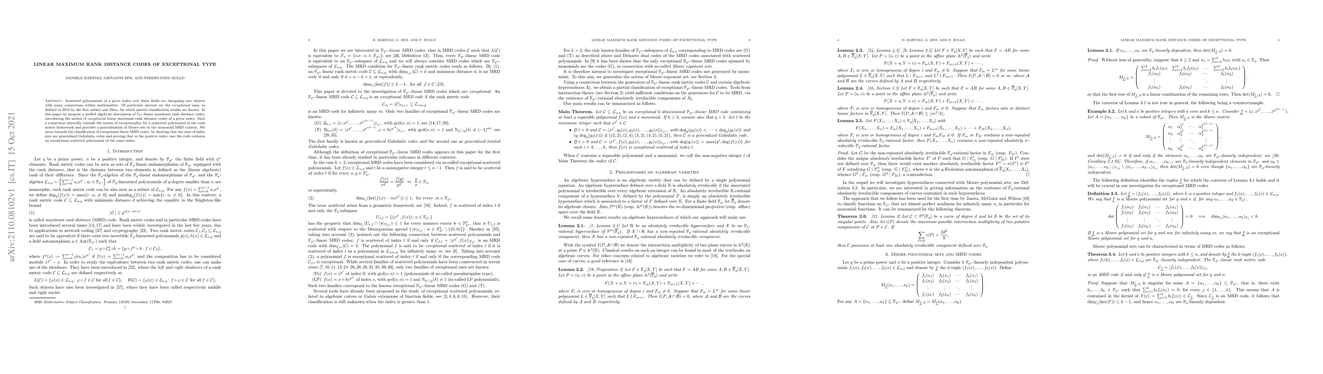 Scattered polynomials of a given index over finite fields are intriguing rare objects with many connections within mathematics. Of particular interest are the exceptional ones, as defined in 2018 by the first author and Zhou, for which partial classification results are known. In this paper we propose a unified algebraic description of $\mathbb{F}_{q^n}$-linear maximum rank distance codes, introducing the notion of exceptional linear maximum rank distance codes of a given index. Such a connection naturally extends the notion of exceptionality for a scattered polynomial in the rank metric framework and provides a generalization of Moore sets in the monomial MRD context. We move towards the classification of exceptional linear MRD codes, by showing that the ones of index zero are generalized Gabidulin codes and proving that in the positive index case the code contains an exceptional scattered polynomial of the same index.