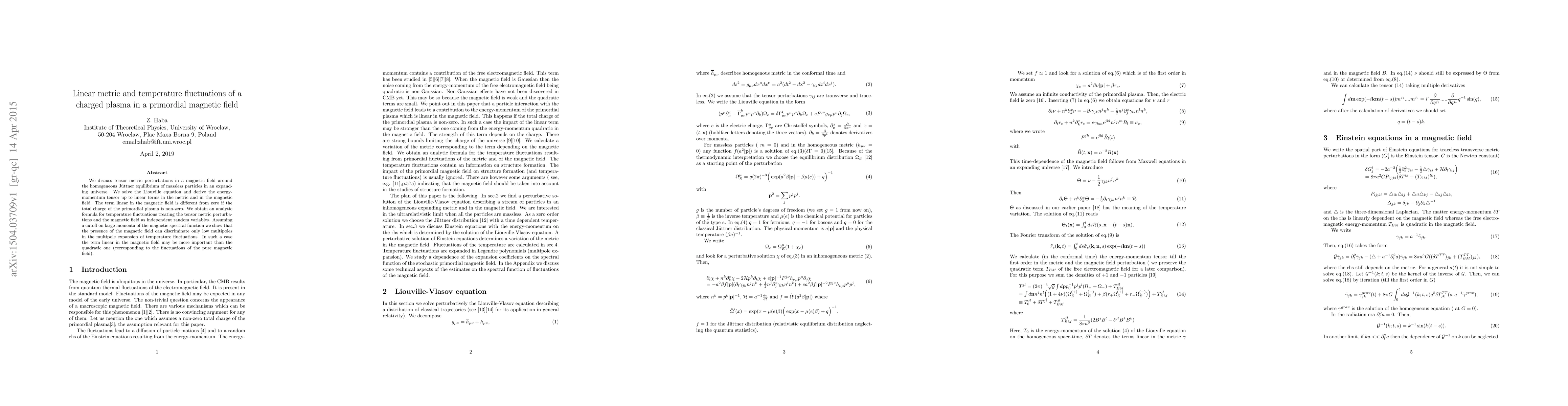 We discuss tensor metric perturbations in a magnetic field around the homogeneous Juttner equilibrium of massless particles in an expanding universe. We solve the Liouville equation and derive the energy-momentum tensor up to linear terms in the metric and in the magnetic field.The term linear in the magnetic field is different from zero if the total charge of the primordial plasma is non-zero. We obtain an analytic formula for temperature fluctuations treating the tensor metric perturbations and the magnetic field as independent random variables. Assuming a cutoff on large momenta of the magnetic spectral function we show that the presence of the magnetic field can discriminate only low multipoles in the multipole expansion of temperature fluctuations. In such a case the term linear in the magnetic field can be more important than the quadratic one (corresponding to the fluctuations of the pure magnetic field).