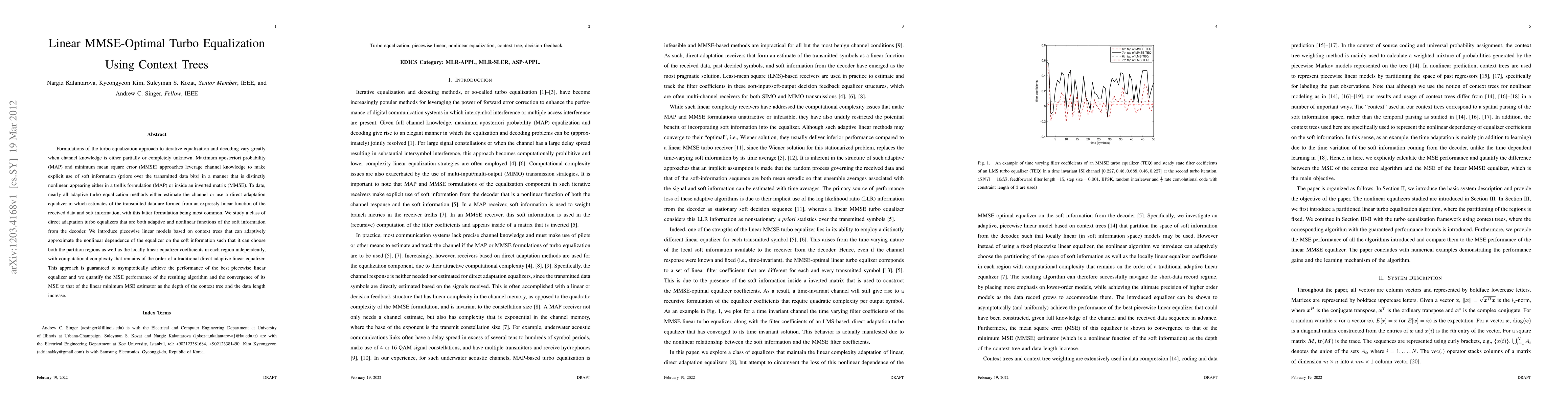 This paper proposes a linear MMSE-optimal turbo equalization method using context trees to adaptively approximate nonlinear dependencies on soft information. The approach achieves performance close to the best piecewise linear equalizer with computational complexity comparable to traditional linear equalizers.