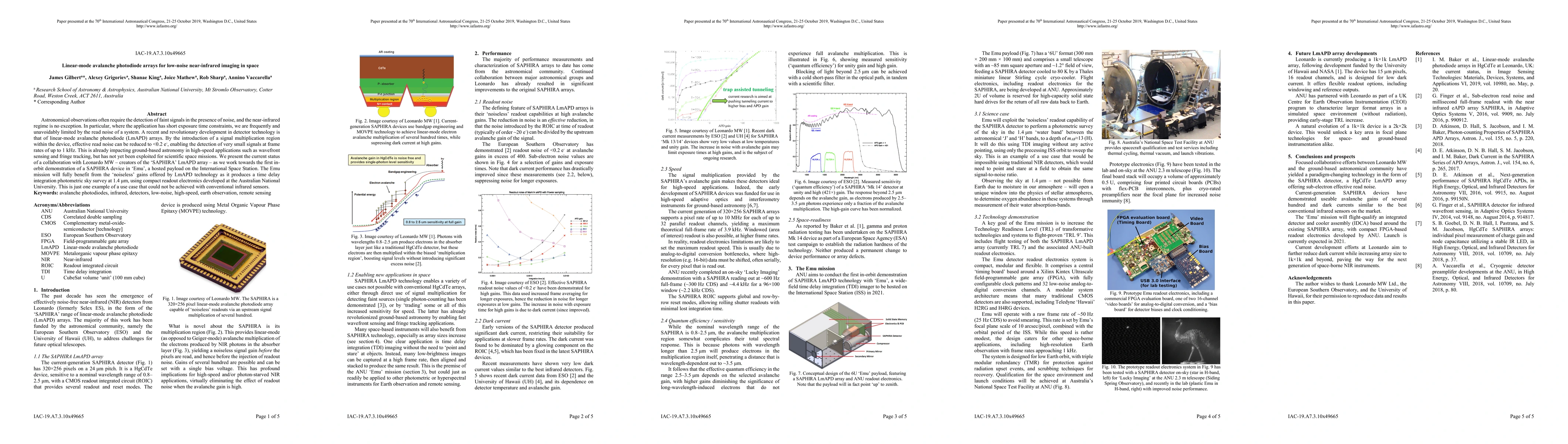 This paper discusses the development of linear-mode avalanche photodiode (LmAPD) arrays for low-noise near-infrared imaging in space, highlighting their potential to reduce read noise and enable high-speed astronomical observations. The collaboration with Leonardo MW aims to demonstrate the 'SAPHIRA' LmAPD array on the 'Emu' payload aboard the International Space Station, showcasing the technology's benefits for space-based photometric sky surveys.