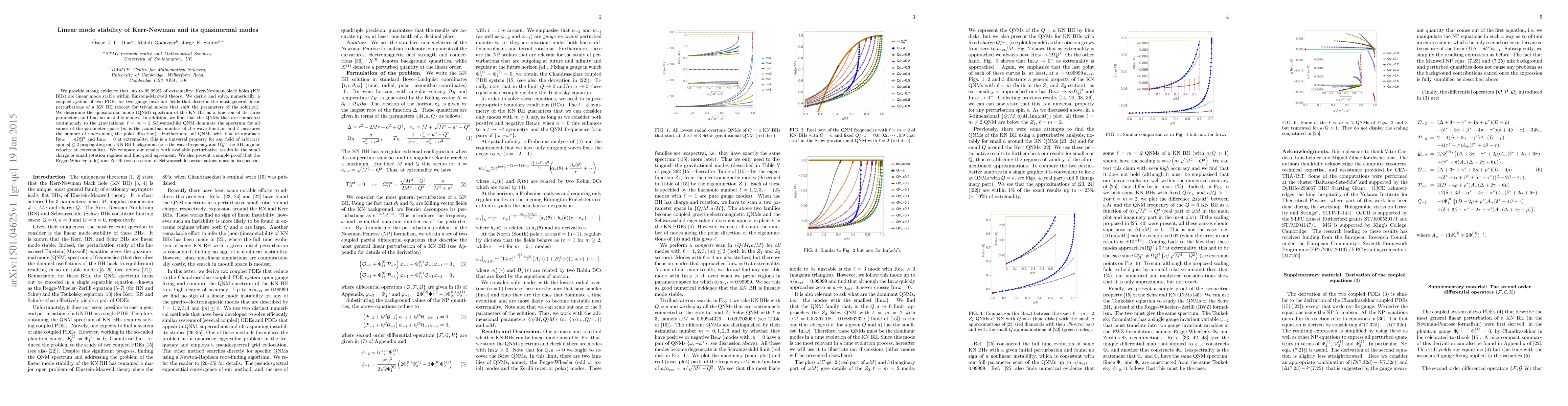 We provide strong evidence that, up to $99.999\%$ of extremality, Kerr-Newman black holes (KN BHs) are linear mode stable within Einstein-Maxwell theory. We derive and solve, numerically, a coupled system of two PDEs for two gauge invariant fields that describe the most general linear perturbations of a KN BH (except for trivial modes that shift the parameters of the solution). We determine the quasinormal mode (QNM) spectrum of the KN BH as a function of its three parameters and find no unstable modes. In addition, we find that the QNMs that are connected continuously to the gravitational $\ell=m=2$ Schwarzschild QNM dominate the spectrum for all values of the parameter space ($m$ is the azimuthal number of the wave function and $\ell$ measures the number of nodes along the polar direction). Furthermore, all QNMs with $\ell=m$ approach Re$\,\omega = m \Omega_H^{ext}$ and Im$\,\omega=0$ at extremality; this is a universal property for any field of arbitrary spin $|s|\leq 2$ propagating on a KN BH background ($\omega$ is the wave frequency and $\Omega_H^{ext}$ the BH angular velocity at extremality). We compare our results with available perturbative results in the small charge or small rotation regimes and find good agreement. We also present a simple proof that the Regge-Wheeler (odd) and Zerilli (even) sectors of Schwarzschild perturbations must be isospectral.