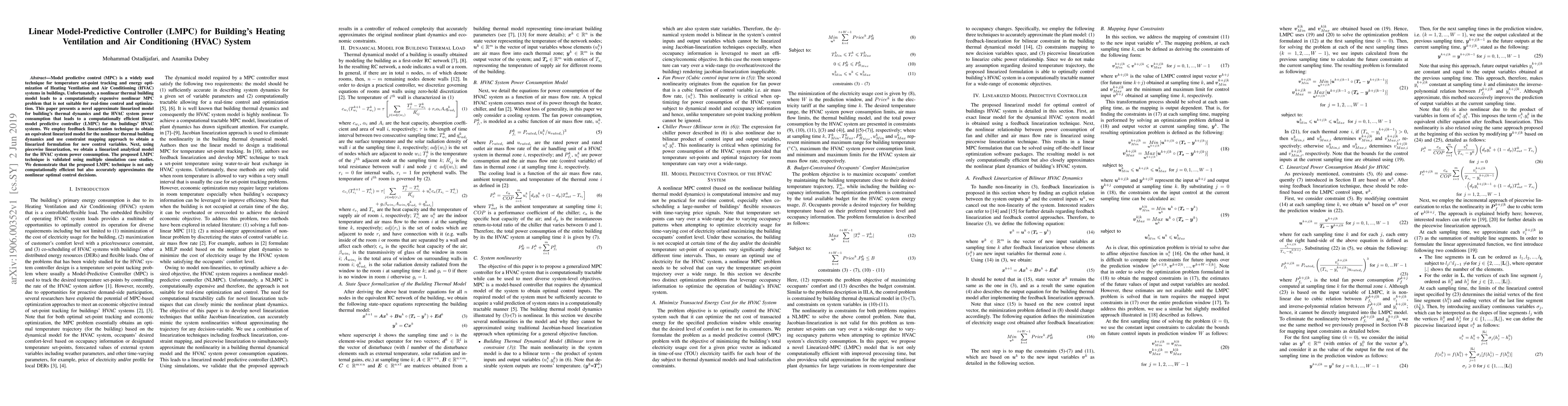 This paper proposes a computationally efficient linear model predictive controller (LMPC) for building HVAC systems by linearizing the nonlinear thermal dynamics and power consumption models. The LMPC technique is validated through simulations, showing it effectively approximates nonlinear optimal control decisions.