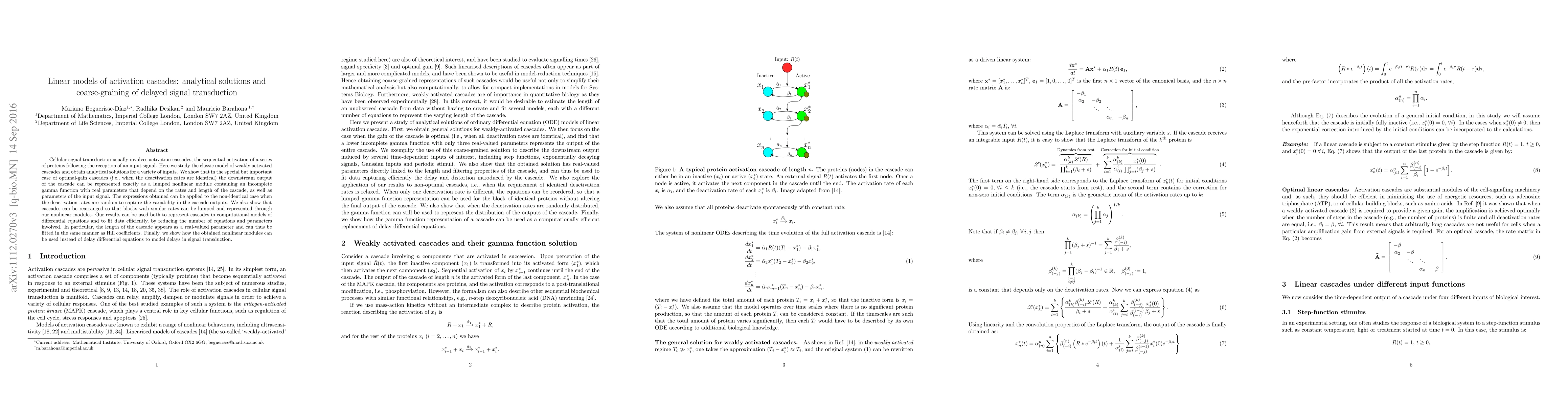 Cellular signal transduction usually involves activation cascades, the sequential activation of a series of proteins following the reception of an input signal. Here we study the classic model of weakly activated cascades and obtain analytical solutions for a variety of inputs. We show that in the special but important case of optimal-gain cascades (i.e., when the deactivation rates are identical) the downstream output of the cascade can be represented exactly as a lumped nonlinear module containing an incomplete gamma function with real parameters that depend on the rates and length of the cascade, as well as parameters of the input signal. The expressions obtained can be applied to the non-identical case when the deactivation rates are random to capture the variability in the cascade outputs. We also show that cascades can be rearranged so that blocks with similar rates can be lumped and represented through our nonlinear modules. Our results can be used both to represent cascades in computational models of differential equations and to fit data efficiently, by reducing the number of equations and parameters involved. In particular, the length of the cascade appears as a real-valued parameter and can thus be fitted in the same manner as Hill coefficients. Finally, we show how the obtained nonlinear modules can be used instead of delay differential equations to model delays in signal transduction.