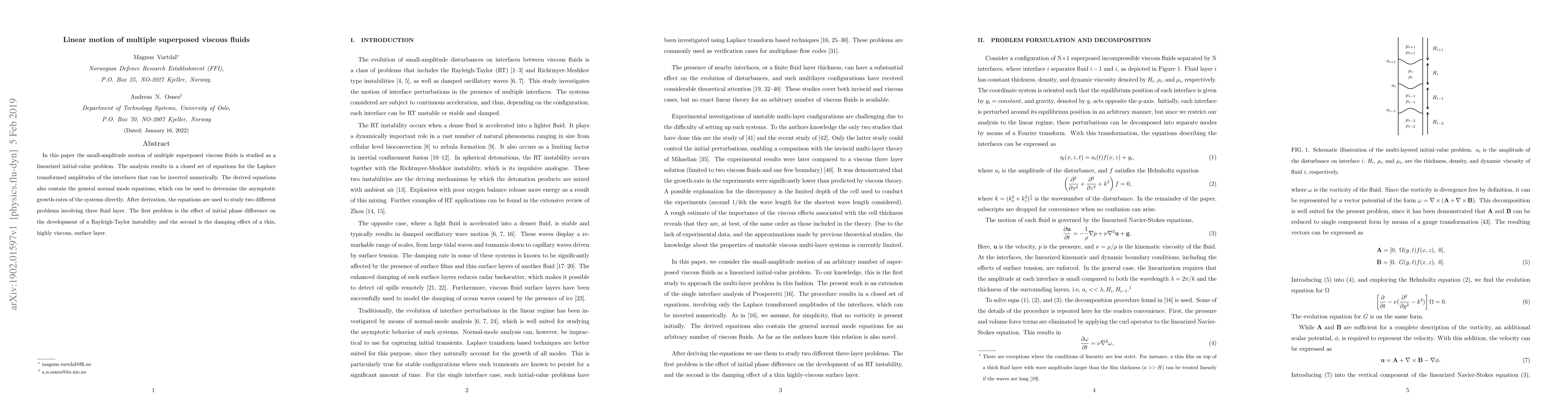 In this paper the small-amplitude motion of multiple superposed viscous fluids is studied as a linearized initial-value problem. The analysis results in a closed set of equations for the Laplace transformed amplitudes of the interfaces that can be inverted numerically. The derived equations also contain the general normal mode equations, which can be used to determine the asymptotic growth-rates of the systems directly. After derivation, the equations are used to study two different problems involving three fluid layer. The first problem is the effect of initial phase difference on the development of a Rayleigh-Taylor instability and the second is the damping effect of a thin, highly viscous, surface layer.