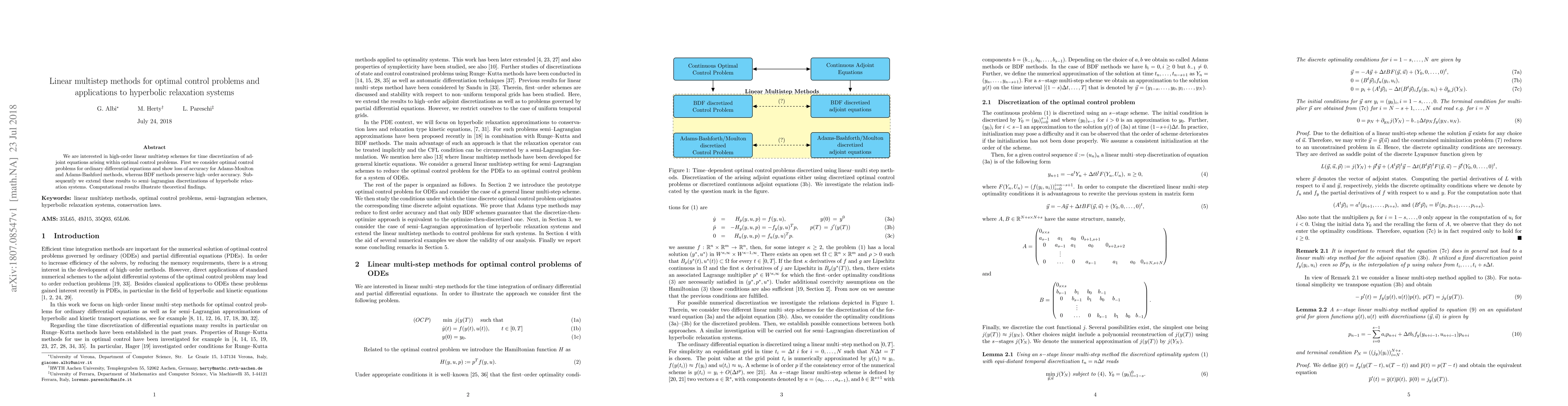 We are interested in high-order linear multistep schemes for time discretization of adjoint equations arising within optimal control problems. First we consider optimal control problems for ordinary differential equations and show loss of accuracy for Adams-Moulton and Adams-Bashford methods, whereas BDF methods preserve high--order accuracy. Subsequently we extend these results to semi--lagrangian discretizations of hyperbolic relaxation systems. Computational results illustrate theoretical findings.