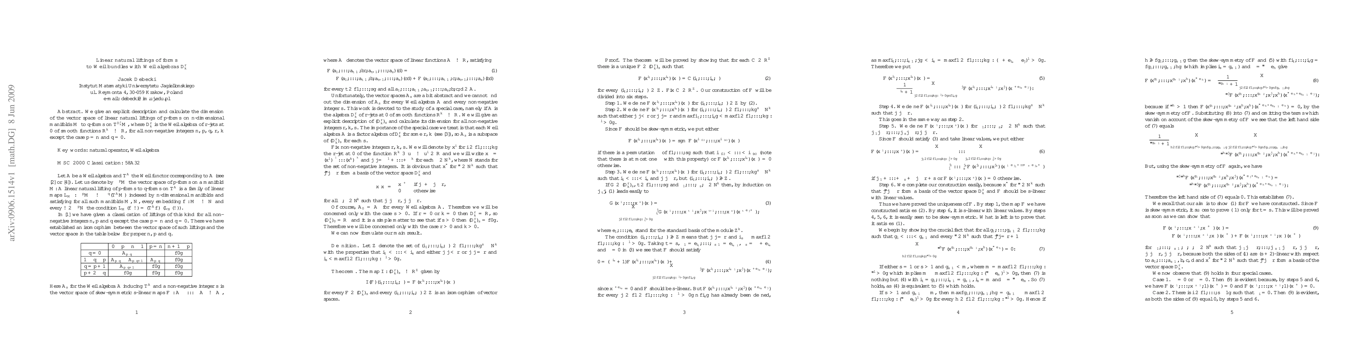 We give an explicit description and calculate the dimension of the vector space of linear natural liftings of $p$-forms on $n$-dimensional manifolds $M$ to $q$-forms on $T^{{\mathbb D}^r_k}M$, where ${\mathbb D}^r_k$ is the Weil algebra of $r$-jets at 0 of smooth functions ${\mathbb R}^k\longrightarrow{\mathbb R}$, for all non-negative integers $n$, $p$, $q$, $r$, $k$ except the case $p=n$ and $q=0$.