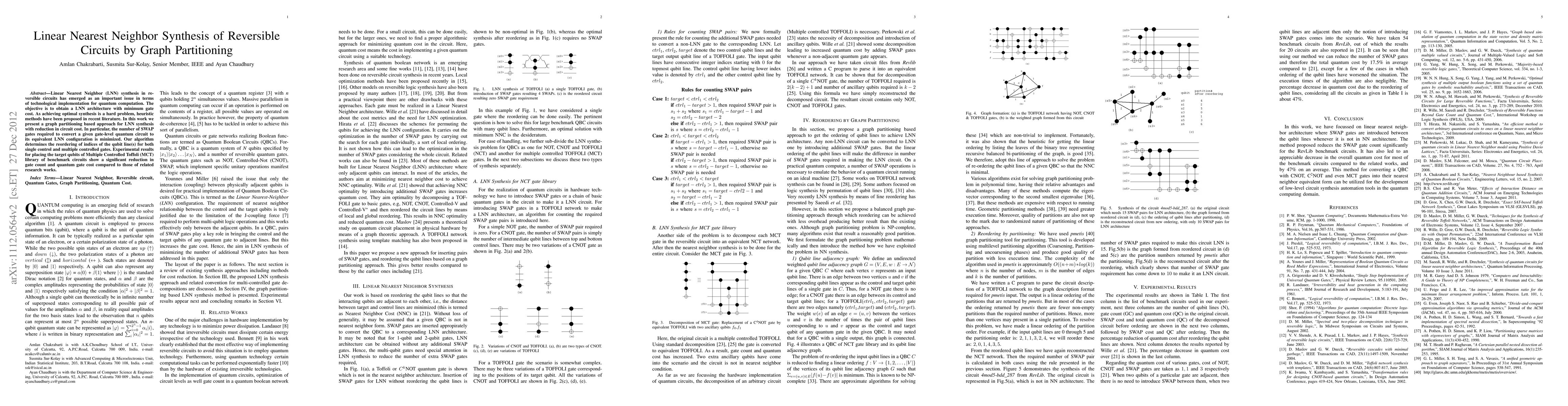 This paper proposes a graph partitioning method for Linear Nearest Neighbor (LNN) synthesis in reversible circuits to minimize gate cost, particularly focusing on reducing the number of SWAP gates in quantum computation. Experimental results demonstrate a significant reduction in gate count and cost compared to existing methods.