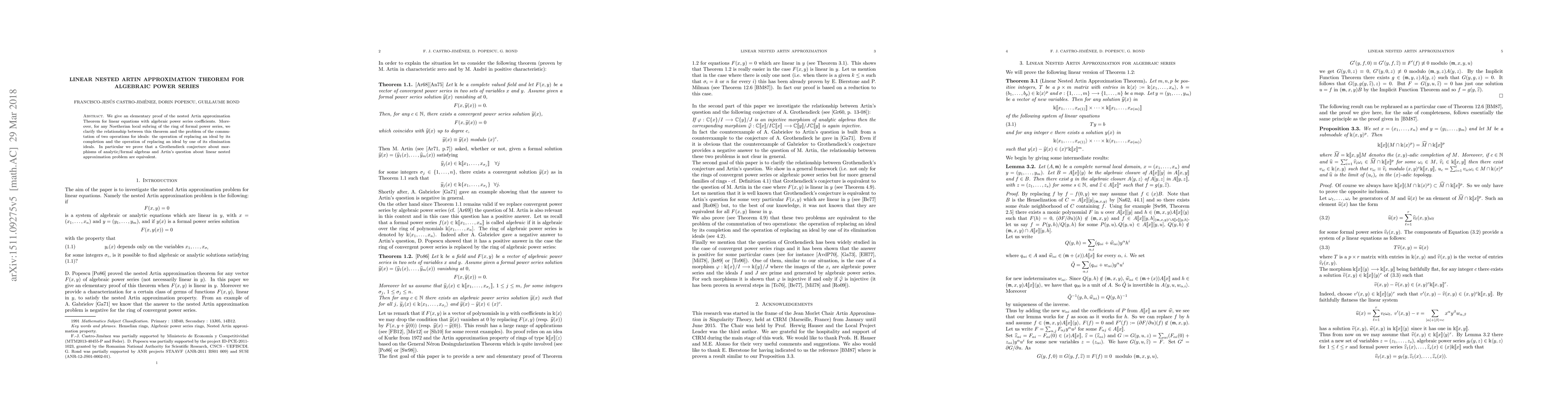 We give a new and elementary proof of the nested Artin approximation Theorem for linear equations with algebraic power series coefficients. Moreover, for any Noetherian local subring of the ring of formal power series, we clarify the relationship between this theorem and the problem of the com-mutation of two operations for ideals: the operation of replacing an ideal by its completion and the operation of replacing an ideal by one of its elimination ideals.