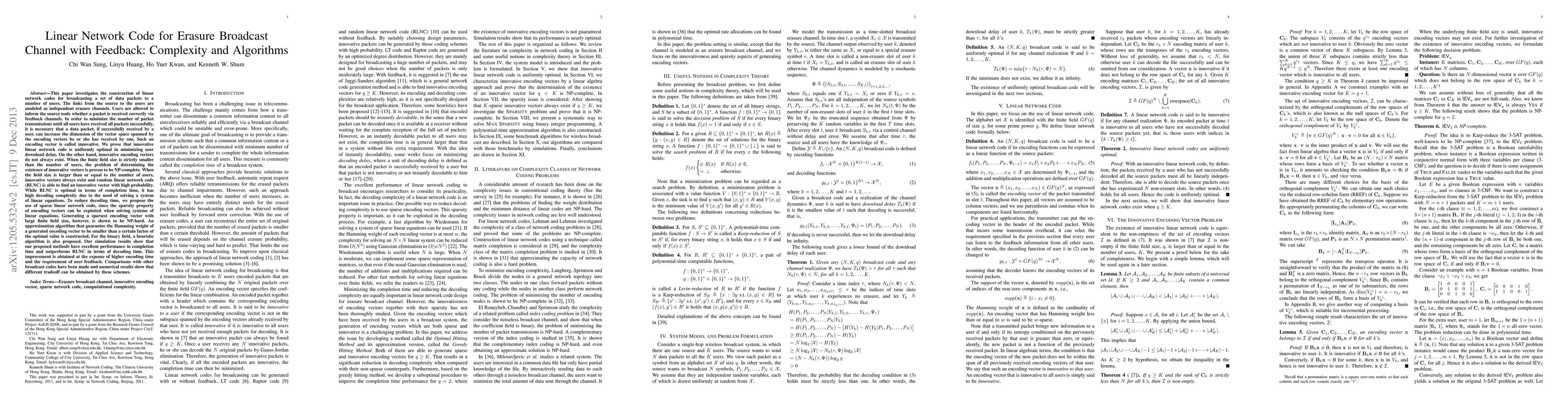 This paper investigates the construction of linear network codes for broadcasting a set of data packets to a number of users. The links from the source to the users are modeled as independent erasure channels. Users are allowed to inform the source node whether a packet is received correctly via feedback channels. In order to minimize the number of packet transmissions until all users have received all packets successfully, it is necessary that a data packet, if successfully received by a user, can increase the dimension of the vector space spanned by the encoding vectors he or she has received by one. Such an encoding vector is called innovative. We prove that innovative linear network code is uniformly optimal in minimizing user download delay. When the finite field size is strictly smaller than the number of users, the problem of determining the existence of innovative vectors is proven to be NP-complete. When the field size is larger than or equal to the number of users, innovative vectors always exist and random linear network code (RLNC) is able to find an innovative vector with high probability. While RLNC is optimal in terms of completion time, it has high decoding complexity due to the need of solving a system of linear equations. To reduce decoding time, we propose the use of sparse linear network code, since the sparsity property of encoding vectors can be exploited when solving systems of linear equations. Generating a sparsest encoding vector with large finite field size, however, is shown to be NP-hard. An approximation algorithm that guarantee the Hamming weight of a generated encoding vector to be smaller than a certain factor of the optimal value is constructed. Our simulation results show that our proposed methods have excellent performance in completion time and outperforms RLNC in terms of decoding time.