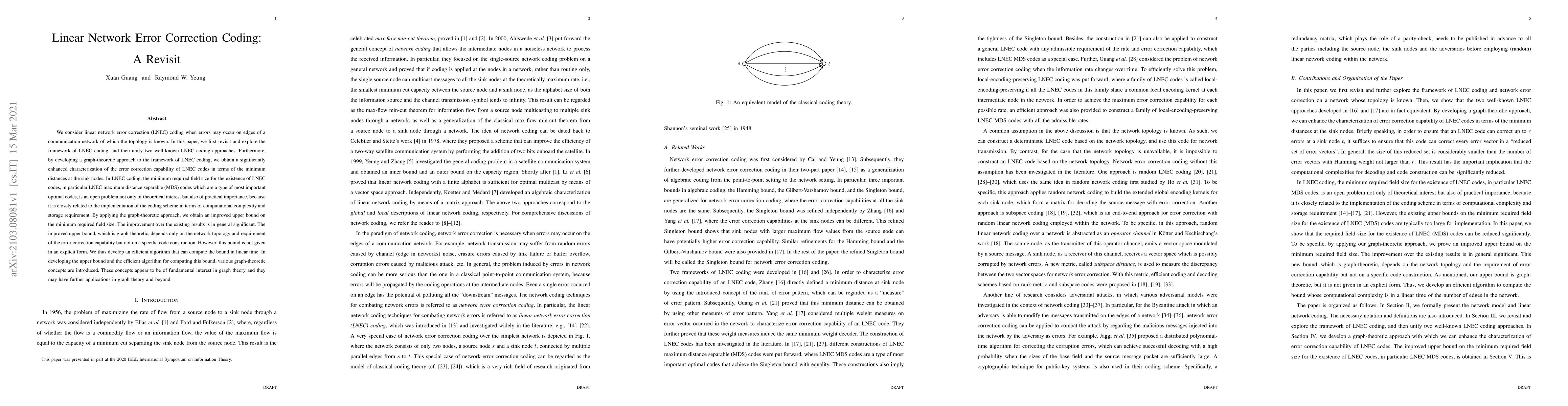 This paper revisits linear network error correction (LNEC) coding, unifies existing approaches, and introduces a graph-theoretic framework to enhance the characterization of LNEC codes' error correction capability. It provides an improved upper bound on the minimum field size for LNEC codes, along with an efficient algorithm to compute this bound in linear time, which could have broader applications in graph theory.