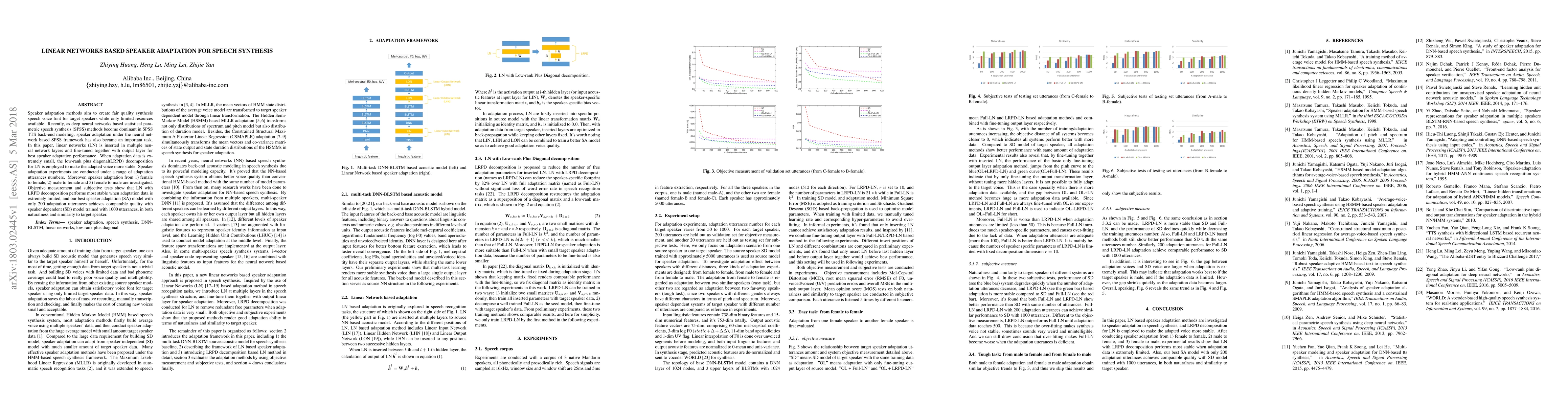 Speaker adaptation methods aim to create fair quality synthesis speech voice font for target speakers while only limited resources available. Recently, as deep neural networks based statistical parametric speech synthesis (SPSS) methods become dominant in SPSS TTS back-end modeling, speaker adaptation under the neural network based SPSS framework has also became an important task. In this paper, linear networks (LN) is inserted in multiple neural network layers and fine-tuned together with output layer for best speaker adaptation performance. When adaptation data is extremely small, the low-rank plus diagonal(LRPD) decomposition for LN is employed to make the adapted voice more stable. Speaker adaptation experiments are conducted under a range of adaptation utterances numbers. Moreover, speaker adaptation from 1) female to female, 2) male to female and 3) female to male are investigated. Objective measurement and subjective tests show that LN with LRPD decomposition performs most stable when adaptation data is extremely limited, and our best speaker adaptation (SA) model with only 200 adaptation utterances achieves comparable quality with speaker dependent (SD) model trained with 1000 utterances, in both naturalness and similarity to target speaker.