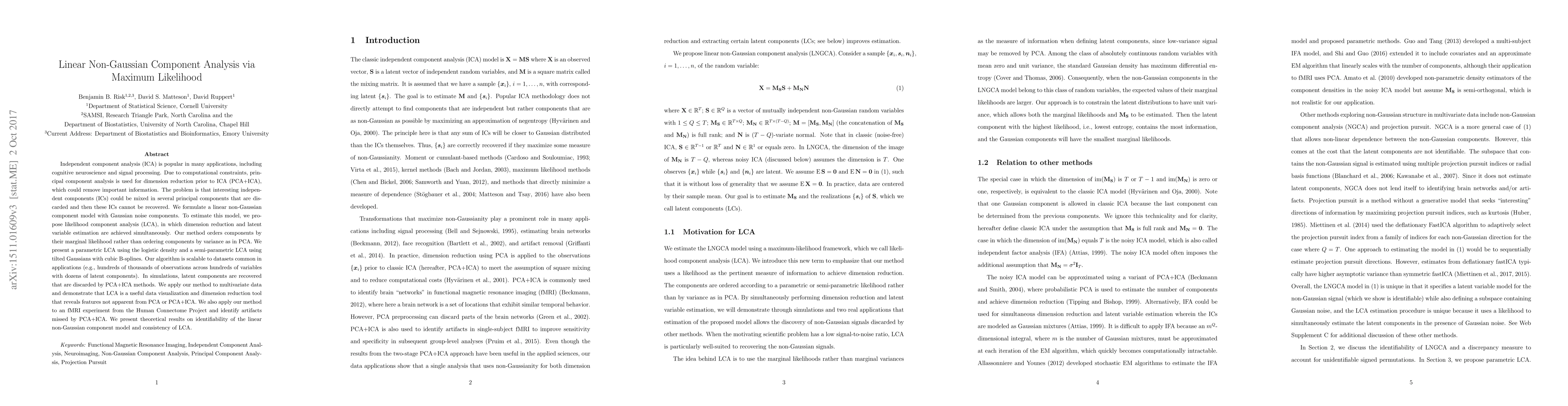 This paper proposes likelihood component analysis (LCA) to improve independent component analysis (ICA) by simultaneously achieving dimension reduction and latent variable estimation. Unlike PCA+ICA, LCA orders components by marginal likelihood, recovering important independent components that PCA discards. The method is scalable and demonstrated to reveal features not visible through PCA or PCA+ICA, as shown in fMRI data from the Human Connectome Project.