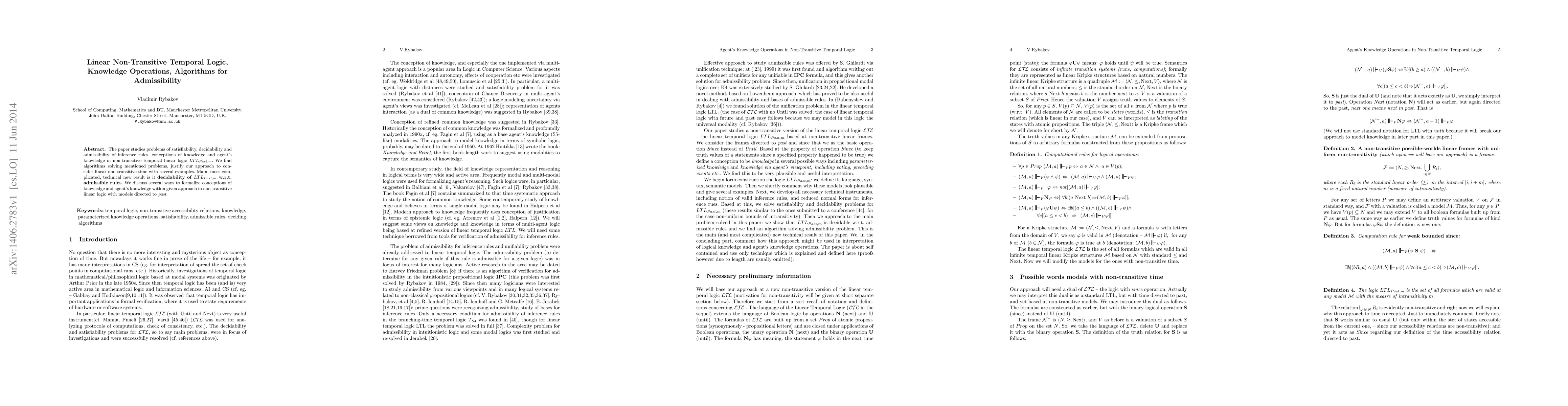The paper investigates the satisfiability, decidability, and admissibility of inference rules in linear non-transitive temporal logic LTL(Past,m), presenting algorithms to solve these problems. The key technical result is the decidability of LTL(Past,m) concerning admissible rules, and it explores formalizing knowledge concepts within this non-transitive temporal framework.