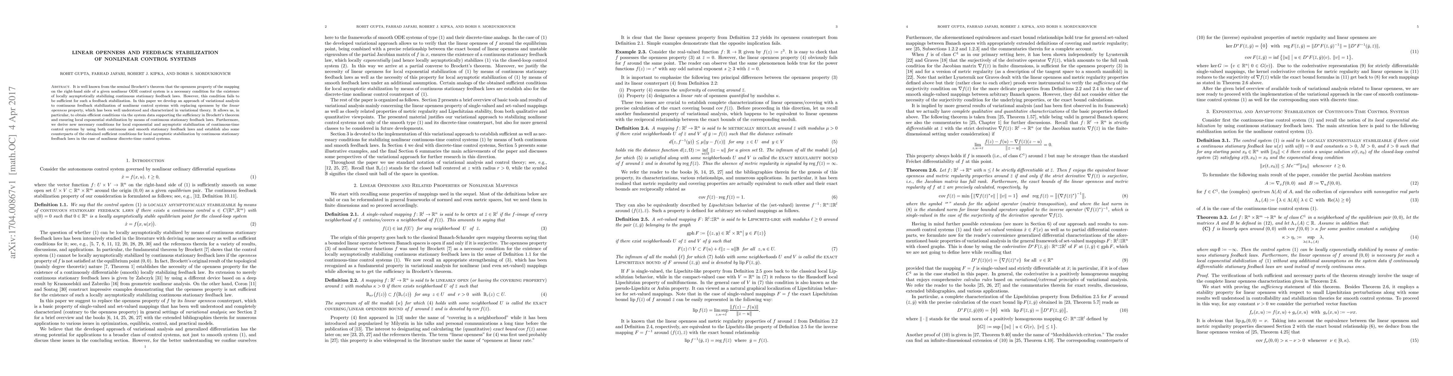 This paper develops variational analysis techniques to achieve continuous feedback stabilization of nonlinear control systems, replacing the insufficient openness condition with the more robust linear openness property. It establishes sufficient conditions for local exponential stabilization and derives necessary conditions for both local exponential and asymptotic stabilization.