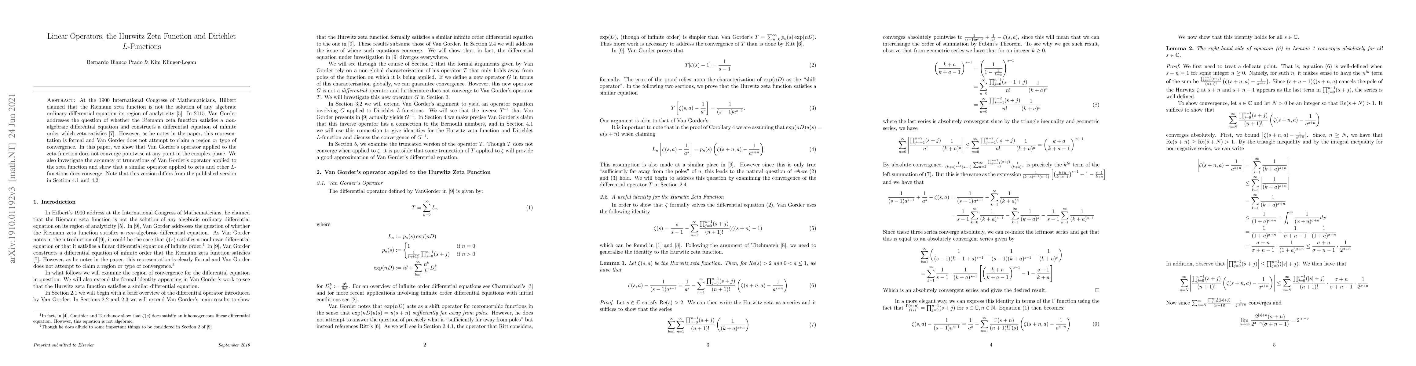 At the 1900 International Congress of Mathematicians, Hilbert claimed that the Riemann zeta function is not the solution of any algebraic ordinary differential equation its region of analyticity \cite{HilbertProb}. In 2015, Van Gorder addresses the question of whether the Riemann zeta function satisfies a {\it non}-algebraic differential equation and constructs a differential equation of infinite order which zeta satisfies \cite{RHequiv}. However, as he notes in the paper, this representation is formal and Van Gorder does not attempt to claim a region or type of convergence. In this paper, we show that Van Gorder's operator applied to the zeta function does not converge pointwise at any point in the complex plane. We also investigate the accuracy of truncations of Van Gorder's operator applied to the zeta function and show that a similar operator applied to zeta and other $L$-functions does converge.