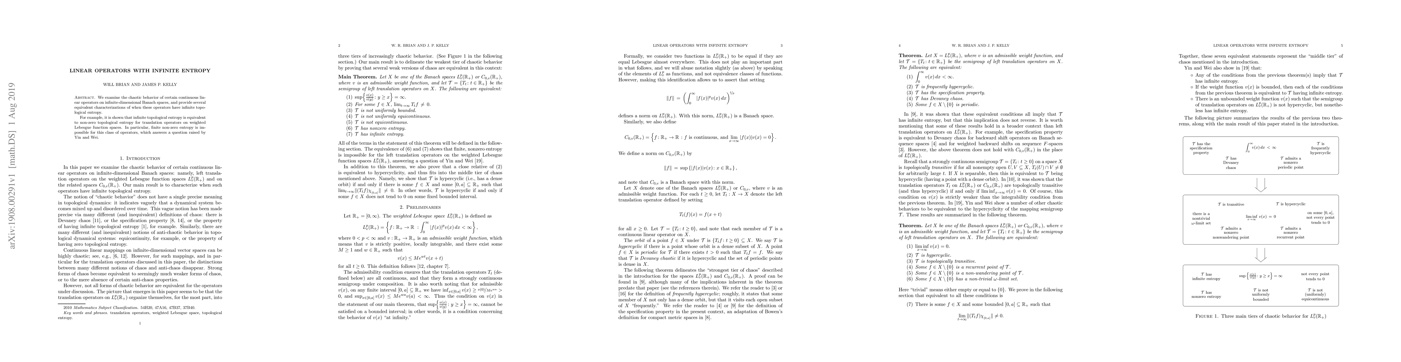 We examine the chaotic behavior of certain continuous linear operators on infinite-dimensional Banach spaces, and provide several equivalent characterizations of when these operators have infinite topological entropy. For example, it is shown that infinite topological entropy is equivalent to non-zero topological entropy for translation operators on weighted Lebesgue function spaces. In particular, finite non-zero entropy is impossible for this class of operators, which answers a question raised by Yin and Wei.