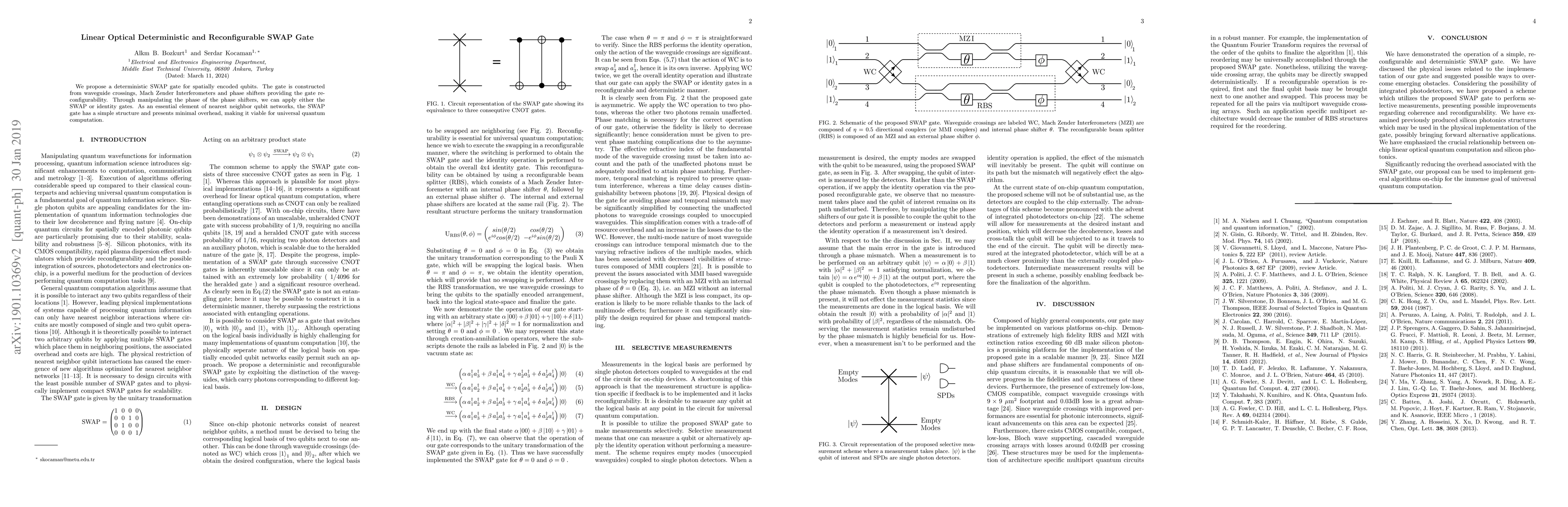 This paper proposes a deterministic and reconfigurable SWAP gate for spatially encoded qubits using waveguide crossings, Mach Zender Interferometers, and phase shifters. The gate can switch between SWAP and identity operations by adjusting the phase shifters, offering minimal overhead for universal quantum computation.