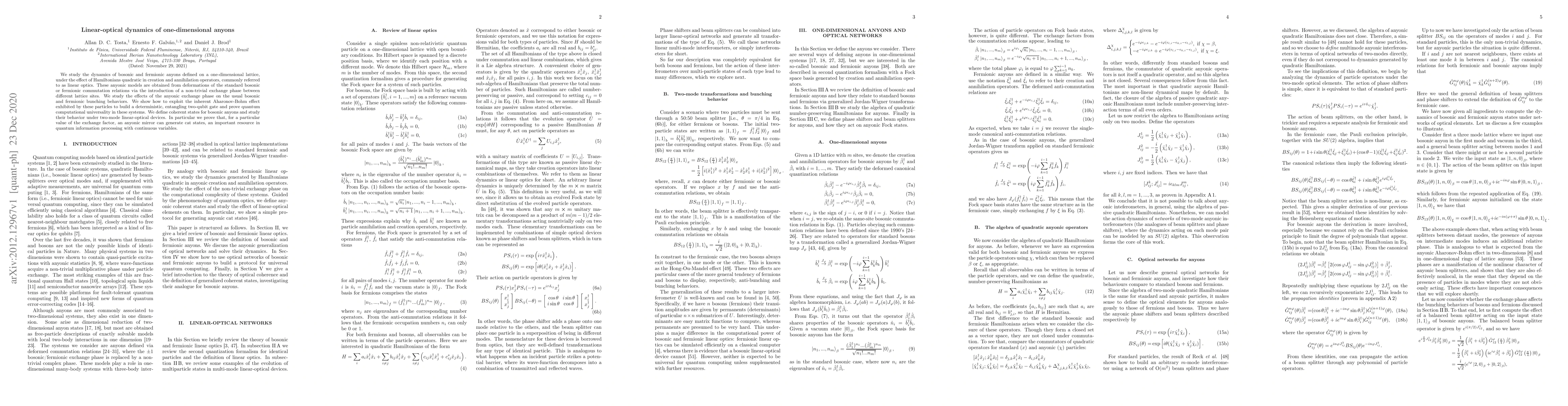 We study the dynamics of bosonic and fermionic anyons defined on a one-dimensional lattice, under the effect of Hamiltonians quadratic in creation and annihilation operators, commonly referred to as linear optics. These anyonic models are obtained from deformations of the standard bosonic or fermionic commutation relations via the introduction of a non-trivial exchange phase between different lattice sites. We study the effects of the anyonic exchange phase on the usual bosonic and fermionic bunching behaviors. We show how to exploit the inherent Aharonov-Bohm effect exhibited by these particles to build a deterministic, entangling two-qubit gate and prove quantum computational universality in these systems. We define coherent states for bosonic anyons and study their behavior under two-mode linear-optical devices. In particular we prove that, for a specific value of the exchange factor, an anyonic mirror can generate cat states, an important resource in quantum information processing with continuous variables.