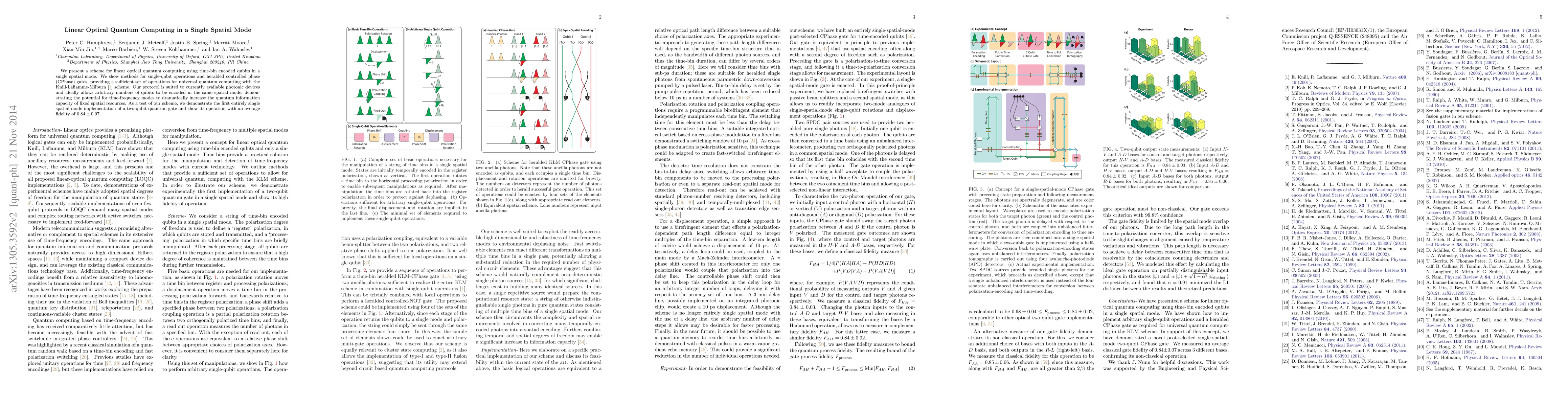 This paper proposes a linear optical quantum computing scheme using time-bin encoded qubits in a single spatial mode, achieving universal quantum computing through single-qubit operations and heralded controlled phase gates. The demonstrated two-qubit gate in a single spatial mode shows an average fidelity of 0.84±0.07.