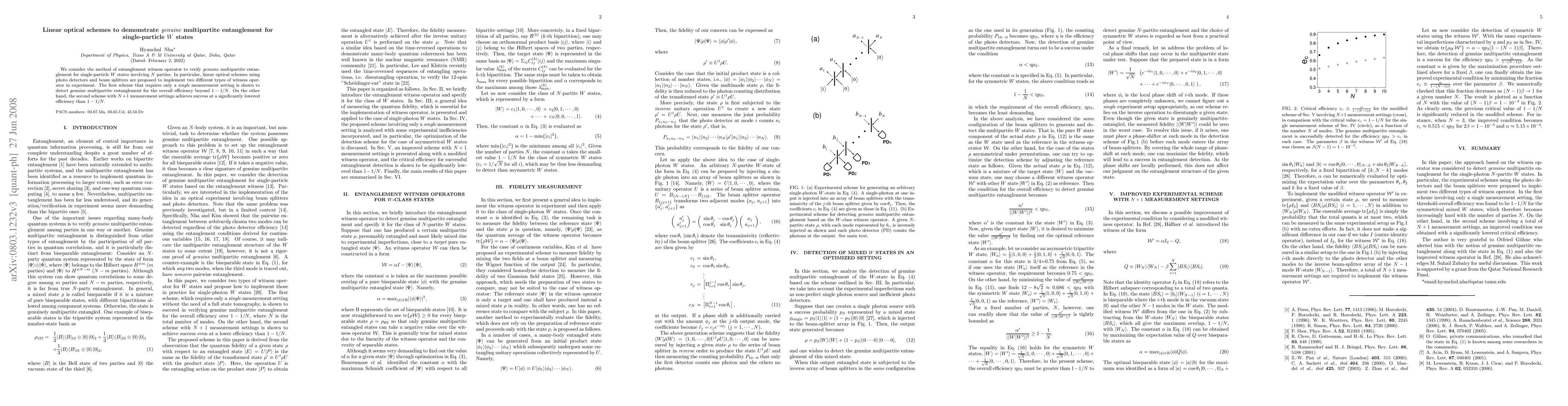 This paper proposes linear optical schemes to verify genuine multipartite entanglement in single-particle W states using entanglement witness operators. The first scheme detects entanglement with an efficiency exceeding 1-1/N, while the second, requiring N+1 measurement settings, achieves lower efficiency.
