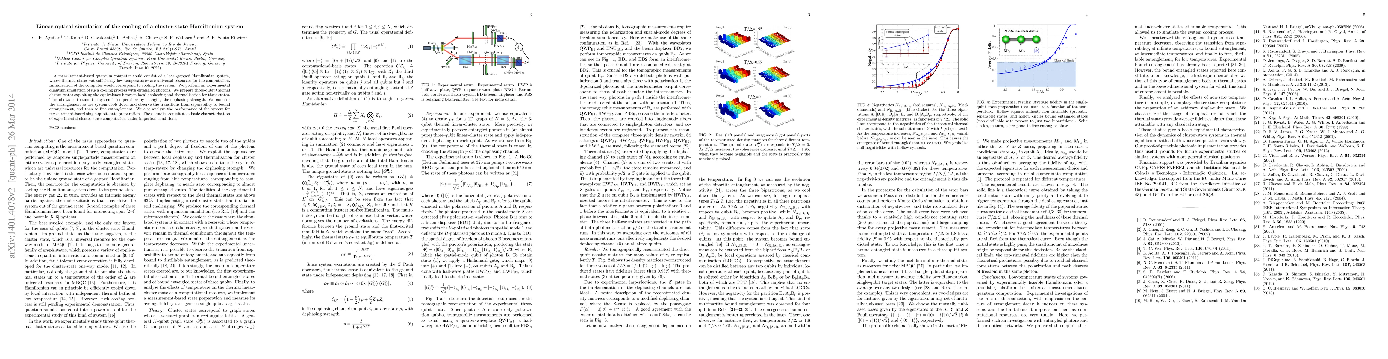 This paper reports an experimental quantum simulation of cooling a local-gapped Hamiltonian system using entangled photons to prepare three-qubit thermal cluster states. The study observes transitions from separability to bound and then free entanglement as the system cools, providing a foundational characterization of cluster-state computation under imperfect conditions.