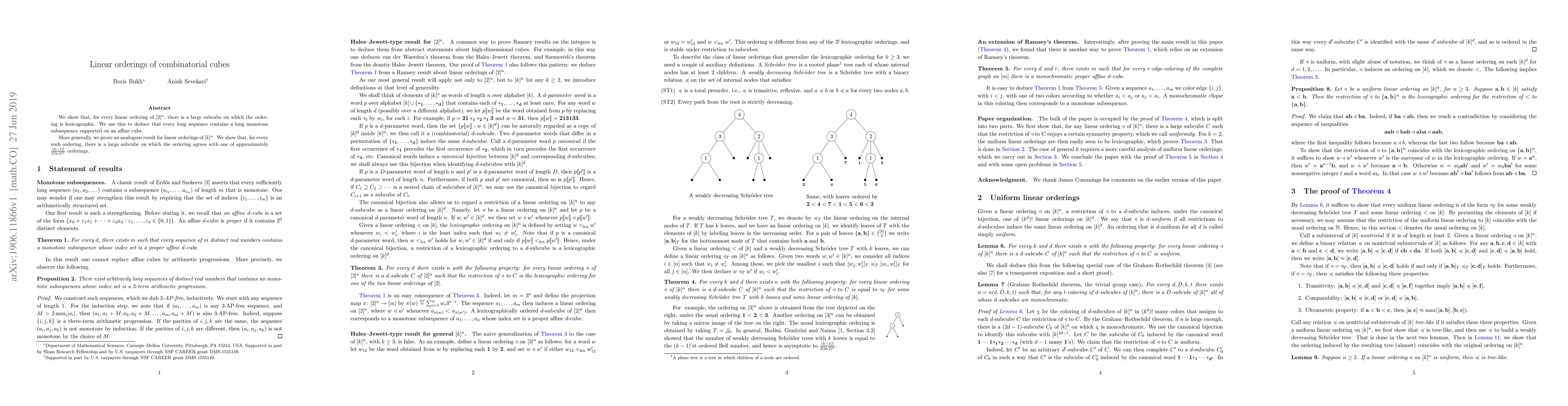 This paper demonstrates that any linear ordering of $[2]^n$ contains a large subcube where the ordering is lexicographic, leading to the conclusion that long sequences have long monotone subsequences on affine cubes. The result extends to $[k]^n$ orderings, showing a large subcube where the ordering matches one of approximately $\frac{(k-1)!}{2(\ln 2)^k}$ orderings.