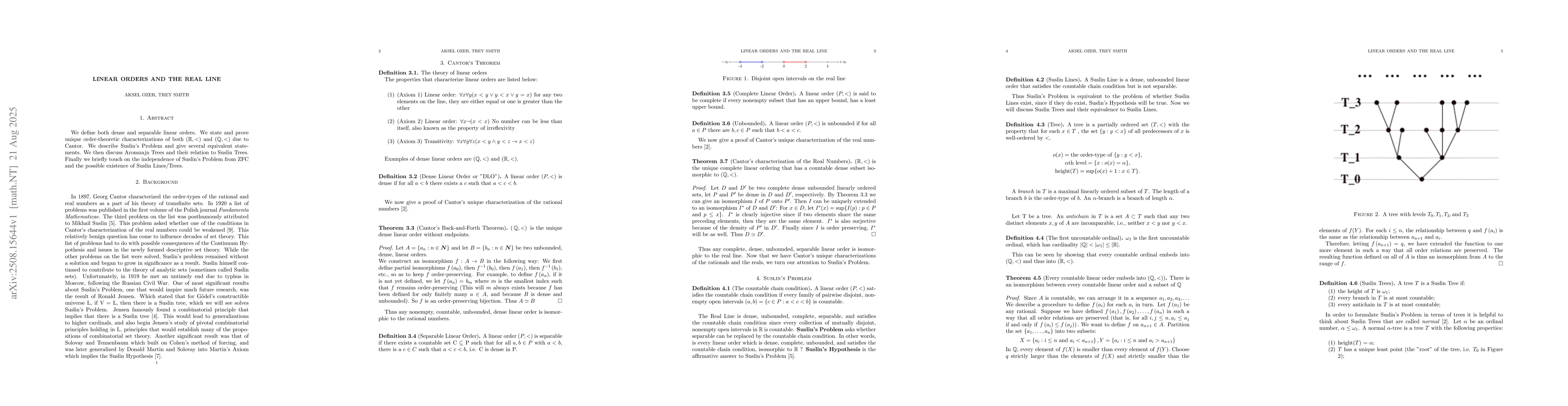 Definitions of dense linear orders (with/without endpoints), separable linear orders, complete linear orders, the countable chain condition for linear orders, a Suslin line/Suslin tree and Suslin's problem Statement and proof of Cantor's Theorem characterizing (Q,<) as the only countable dense linear order without endpoints, up to isomorphism, the corollary which characterizes (R,<) as the only separable complete dense linear order without endpoints, every countable linear order embeds into (Q,<) (and thus, into (R,<)). Explanation of why Suslin lines and Suslin trees are equivalent, what an Aronszjan line/tree is, how it's a weakening of a Suslin line/tree. History and independence of Suslin's problem.