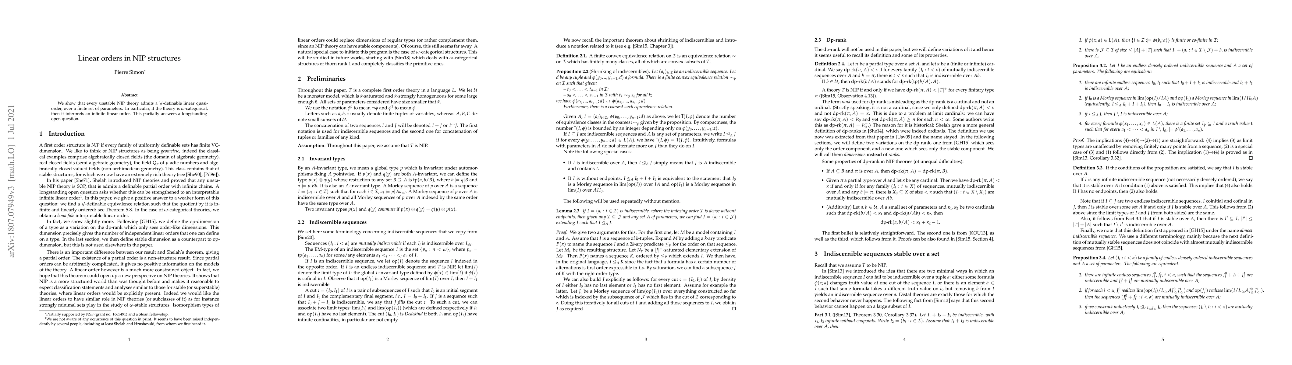Summary: This paper demonstrates that unstable NIP theories contain V-definable linear quasi-orders over finite parameters, and if the theory is omega-categorical, it interprets an infinite linear order, addressing a longstanding open question.