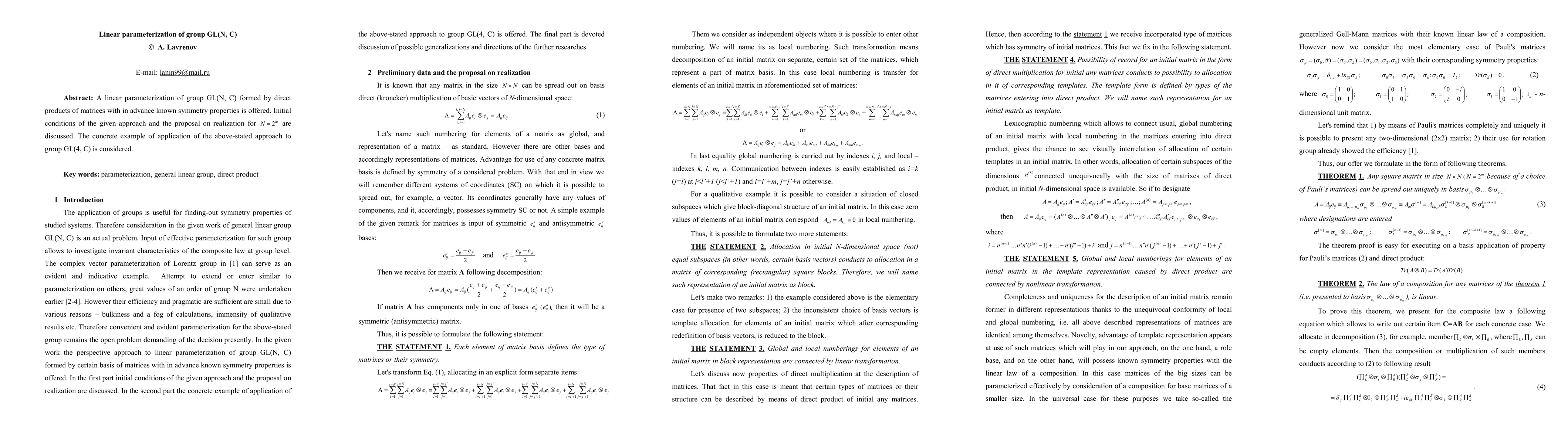 This paper presents a linear parameterization of the group GL(N, C) using direct products of matrices with predefined symmetry properties, and applies this approach specifically to the group GL(4, C). The methodology and initial conditions of the proposed parameterization are discussed.