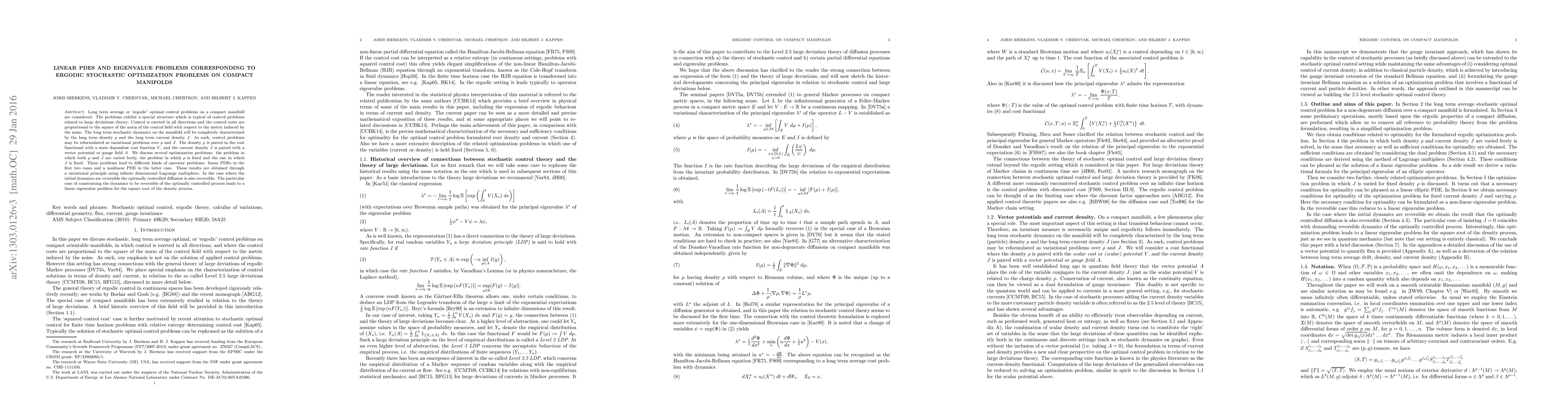 Research investigates how to control stochastic processes on compact manifolds using ergodic optimization problems, leading to linear PDEs and eigenvalue problems for reversible dynamics.