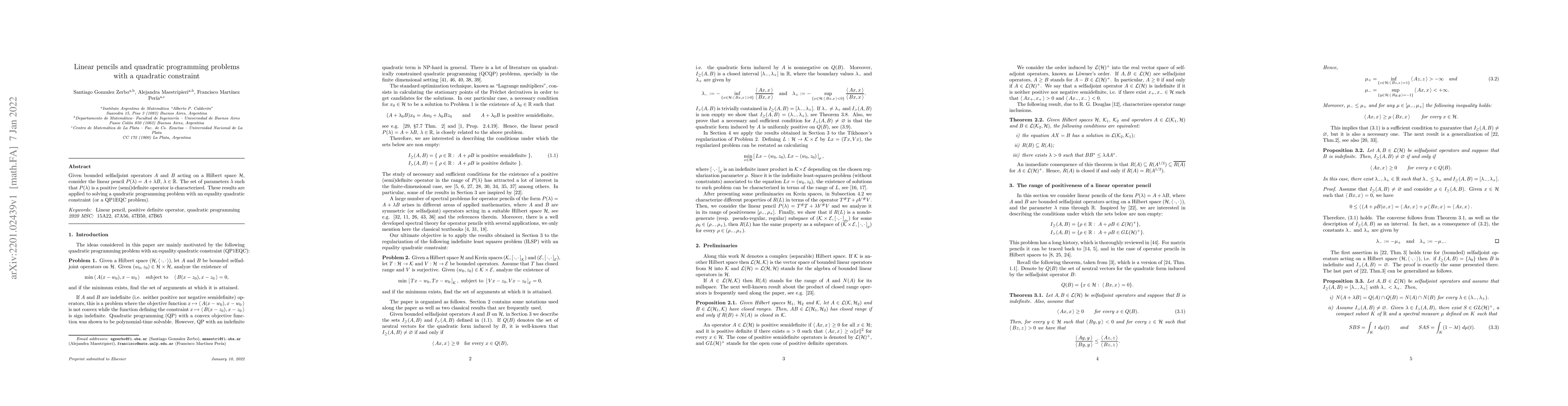 Summary: This paper characterizes the parameters for which a linear pencil formed by bounded selfadjoint operators is positive (semi)definite and applies these results to solve quadratic programming problems with a quadratic equality constraint.