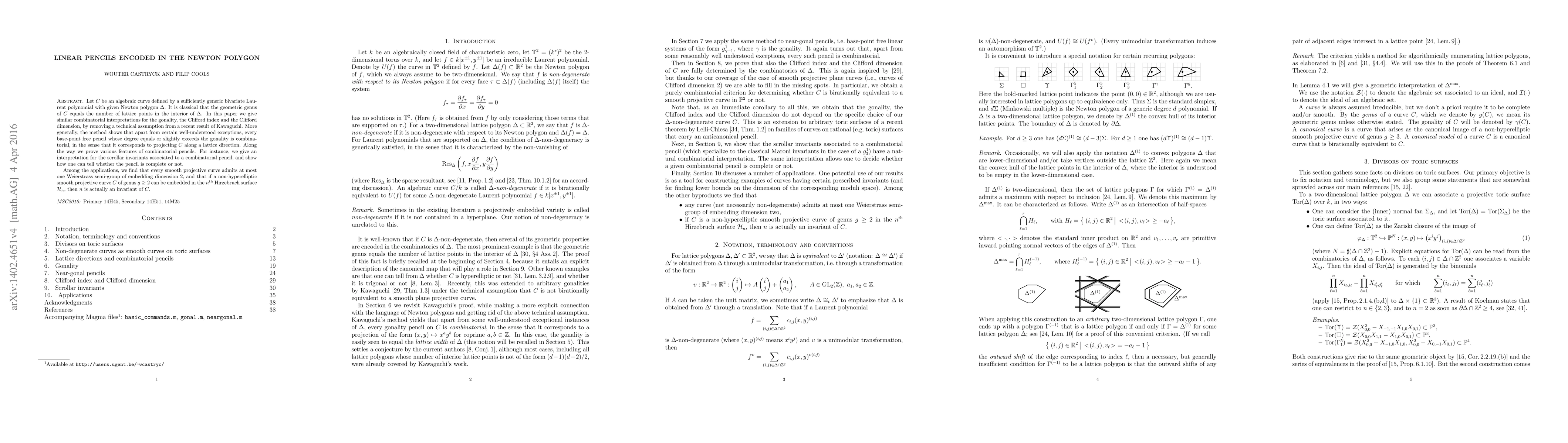 Let $C$ be an algebraic curve defined by a sufficiently generic bivariate Laurent polynomial with given Newton polygon $\Delta$. It is classical that the geometric genus of $C$ equals the number of lattice points in the interior of $\Delta$. In this paper we give similar combinatorial interpretations for the gonality, the Clifford index and the Clifford dimension, by removing a technical assumption from a recent result of Kawaguchi. More generally, the method shows that apart from certain well-understood exceptions, every base-point free pencil whose degree equals or slightly exceeds the gonality is 'combinatorial', in the sense that it corresponds to projecting $C$ along a lattice direction. We then give an interpretation for the scrollar invariants associated to a combinatorial pencil, and show how one can tell whether the pencil is complete or not. Among the applications, we find that every smooth projective curve admits at most one Weierstrass semi-group of embedding dimension $2$, and that if a non-hyperelliptic smooth projective curve $C$ of genus $g \geq 2$ can be embedded in the $n$th Hirzebruch surface $\mathcal{H}_n$, then $n$ is actually an invariant of $C$.