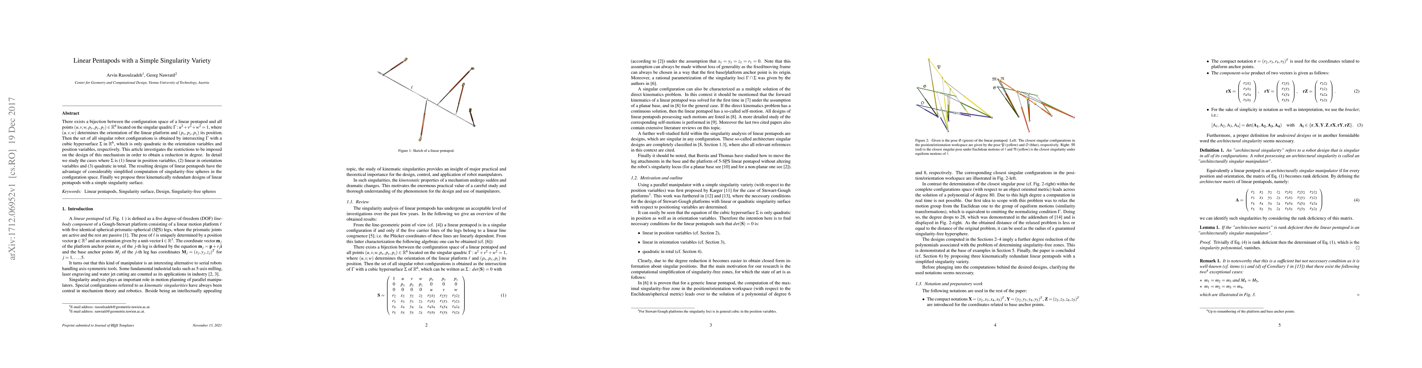 There exists a bijection between the configuration space of a linear pentapod and all points $(u,v,w,p_x,p_y,p_z)\in\mathbb{R}^{6}$ located on the singular quadric $\Gamma: u^2+v^2+w^2=1$, where $(u,v,w)$ determines the orientation of the linear platform and $(p_x,p_y,p_z)$ its position. Then the set of all singular robot configurations is obtained by intersecting $\Gamma$ with a cubic hypersurface $\Sigma$ in $\mathbb{R}^{6}$, which is only quadratic in the orientation variables and position variables, respectively. This article investigates the restrictions to be imposed on the design of this mechanism in order to obtain a reduction in degree. In detail we study the cases where $\Sigma$ is (1) linear in position variables, (2) linear in orientation variables and (3) quadratic in total. The resulting designs of linear pentapods have the advantage of considerably simplified computation of singularity-free spheres in the configuration space. Finally we propose three kinematically redundant designs of linear pentapods with a simple singularity surface.