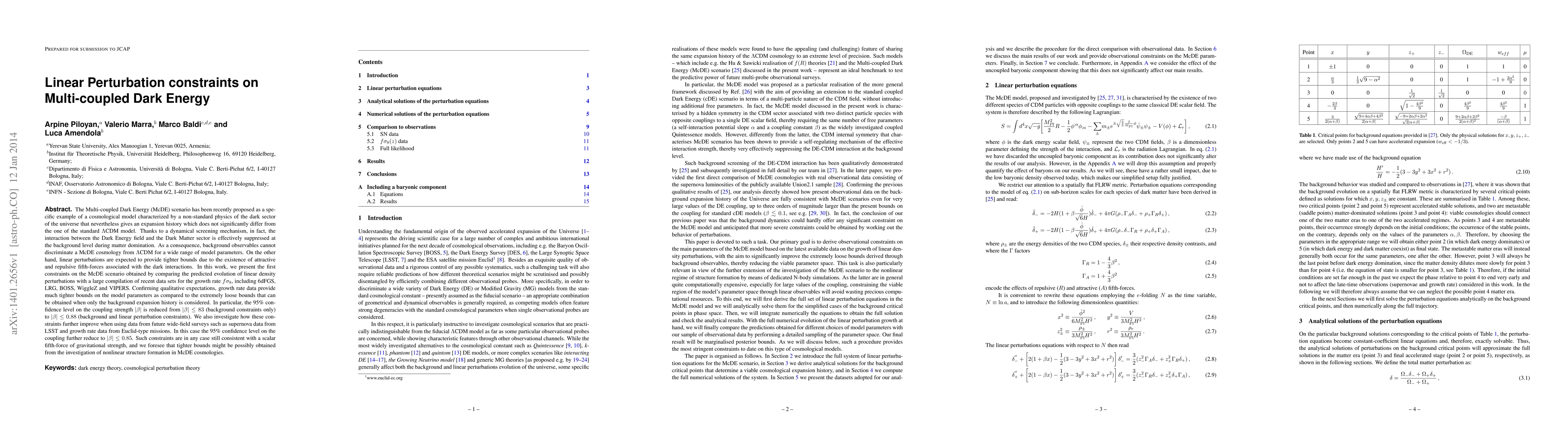This paper presents the first constraints on the Multi-coupled Dark Energy (McDE) scenario by comparing its predicted linear density perturbations with recent observational data. The analysis significantly tightens the bounds on the model's coupling strength, reducing the 95% confidence level from $|\beta |\leq 83$ to $|\beta |\leq 0.88$ when including growth rate data, and further to $|\beta |\leq 0.85$ with future survey data.