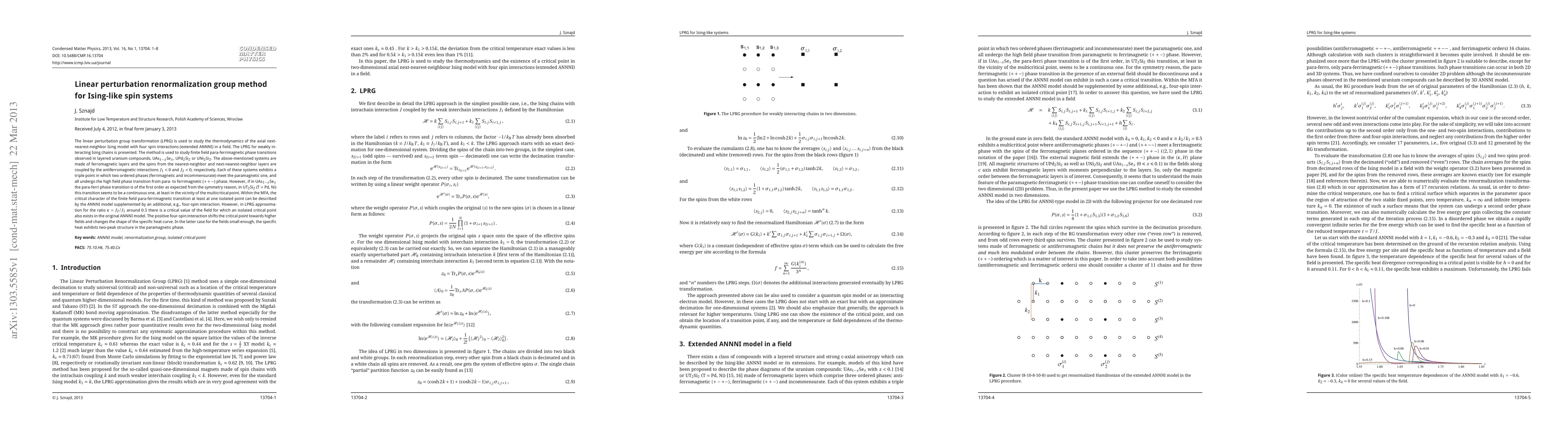 The linear perturbation group transformation (LPRG) is used to study the thermodynamics of the axial next-nearest-neighbor Ising model with four spin interactions (extended ANNNI) in a field. The LPRG for weakly interacting Ising chains is presented. The method is used to study finite field para-ferrimagnetic phase transitions observed in layered uranium compounds, UAs_{1-x}Se_x, UPd_2Si_2 or UNi_2Si_2. The above-mentioned systems are made of ferromagnetic layers and the spins from the nearest-neighbor and next-nearest-neighbor layers are coupled by the antiferromagnetic interactions J_1<0 and J_2<0, respectively. Each of these systems exhibits a triple point in which two ordered phases (ferrimagnetic and incommensurate) meet the paramagnetic one, and all undergo the high field phase transition from para- to ferrimagnetic (++-) phase. However, if in UAs_{1-x}Se_x the para-ferri phase transition is of the first order as expected from the symmetry reason, in UT_2Si_2 (T=Pd,Ni) this transition seems to be a continuous one, at least in the vicinity of the multicritical point. Within the MFA, the critical character of the finite field para-ferrimagnetic transition at least at one isolated point can be described by the ANNNI model supplemented by an additional, e.g., four-spin interaction. However, in LPRG approximation for the ratio \kappa=J_2/J_1 around 0.5 there is a critical value of the field for which an isolated critical point also exists in the original ANNNI model. The positive four-spin interaction shifts the critical point towards higher fields and changes the shape of the specific heat curve. In the latter case for the fields small enough, the specific heat exhibits two-peak structure in the paramagnetic phase.
