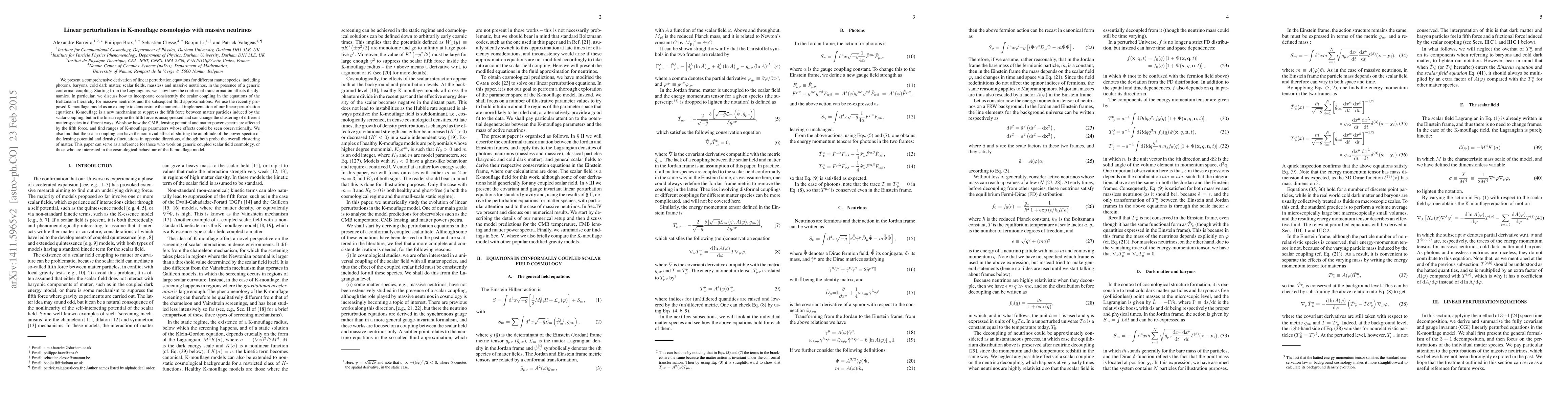We present a comprehensive derivation of linear perturbation equations for different matter species, including photons, baryons, cold dark matter, scalar fields, massless and massive neutrinos, in the presence of a generic conformal coupling. Starting from the Lagrangians, we show how the conformal transformation affects the dynamics. In particular, we discuss how to incorporate consistently the scalar coupling in the equations of the Boltzmann hierarchy for massive neutrinos and the subsequent fluid approximations. We use the recently proposed K-mouflage model as an example to demonstrate the numerical implementation of our linear perturbation equations. K-mouflage is a new mechanism to suppress the fifth force between matter particles induced by the scalar coupling, but in the linear regime the fifth force is unsuppressed and can change the clustering of different matter species in different ways. We show how the CMB, lensing potential and matter power spectra are affected by the fifth force, and find ranges of K-mouflage parameters whose effects could be seen observationally. We also find that the scalar coupling can have the nontrivial effect of shifting the amplitude of the power spectra of the lensing potential and density fluctuations in opposite directions, although both probe the overall clustering of matter. This paper can serve as a reference for those who work on generic coupled scalar field cosmology, or those who are interested in the cosmological behaviour of the K-mouflage model.