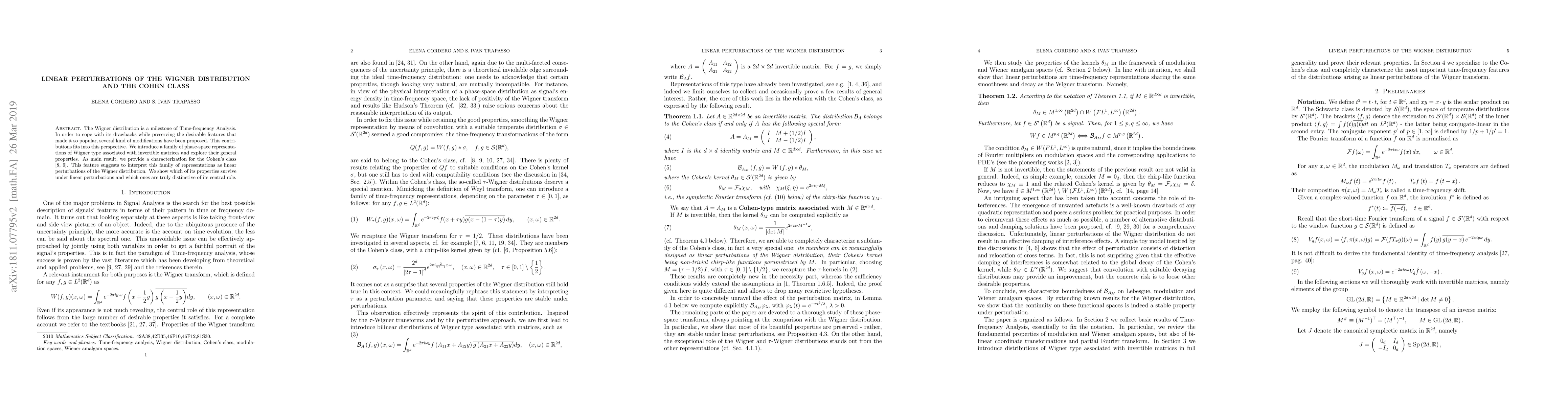 The Wigner distribution is a milestone of Time-frequency Analysis. In order to cope with its drawbacks while preserving the desirable features that made it so popular, several kind of modifications have been proposed. This contributions fits into this perspective. We introduce a family of phase-space representations of Wigner type associated with invertible matrices and explore their general properties. As main result, we provide a characterization for the Cohen's class. This feature suggests to interpret this family of representations as linear perturbations of the Wigner distribution. We show which of its properties survive under linear perturbations and which ones are truly distinctive of its central role.