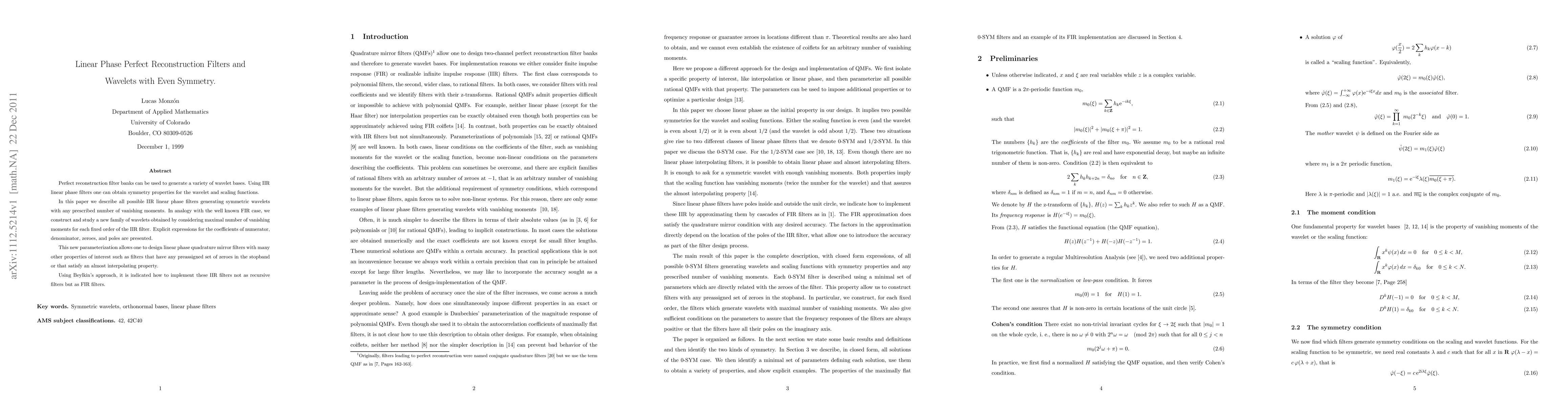 This paper explores IIR linear phase filters for generating symmetric wavelets with prescribed vanishing moments, providing explicit expressions for their coefficients. It also introduces a new parameterization for designing filters with specific properties, and demonstrates their implementation using Beylkin's approach as FIR filters.