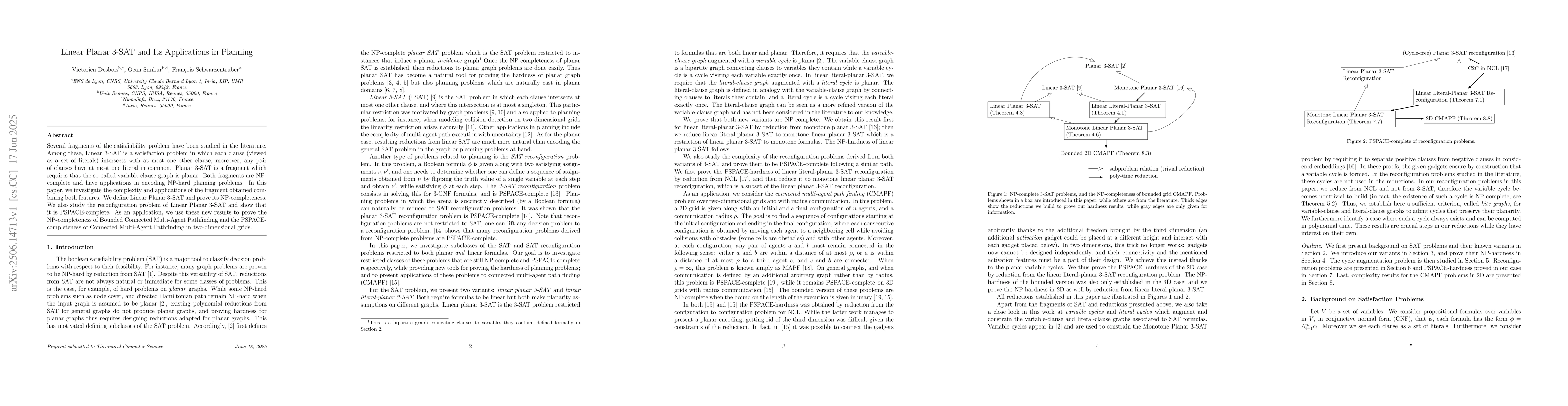 Several fragments of the satisfiability problem have been studied in the literature. Among these, Linear 3-SAT is a satisfaction problem in which each clause (viewed as a set of literals) intersects with at most one other clause; moreover, any pair of clauses have at most one literal in common. Planar 3-SAT is a fragment which requires that the so-called variable-clause graph is planar. Both fragments are NP-complete and have applications in encoding NP-hard planning problems. In this paper, we investigate the complexity and applications of the fragment obtained combining both features. We define Linear Planar 3-SAT and prove its NP-completeness. We also study the reconfiguration problem of Linear Planar 3-SAT and show that it is PSPACE-complete. As an application, we use these new results to prove the NP-completeness of Bounded Connected Multi-Agent Pathfinding and the PSPACE-completeness of Connected Multi-Agent Pathfinding in two-dimensional grids.
