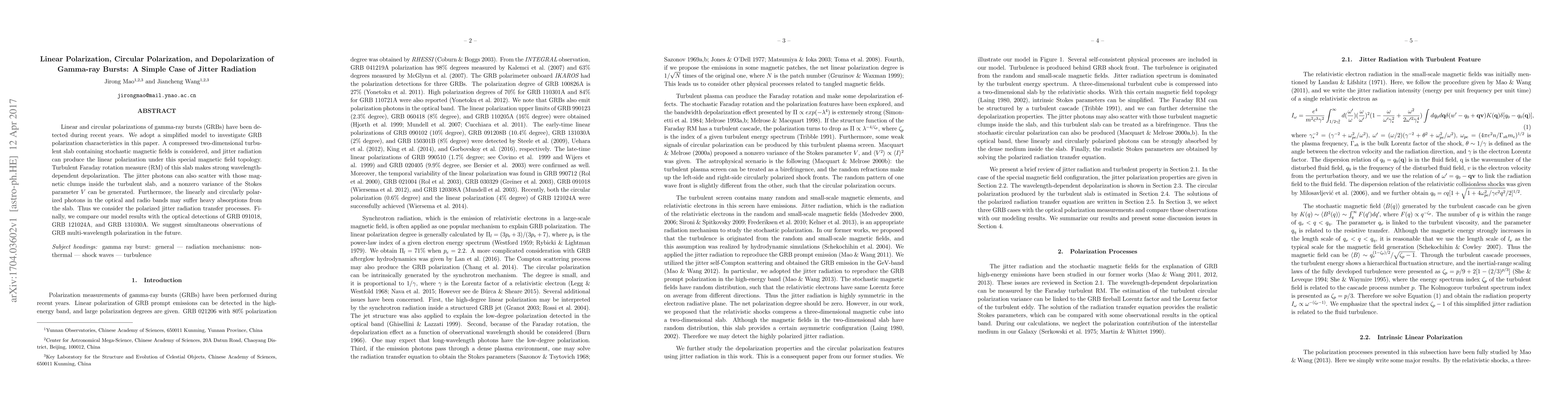 This paper proposes a simplified model for gamma-ray bursts (GRBs) polarization, attributing linear polarization to jitter radiation in a turbulent magnetic field slab. It explains depolarization via Faraday rotation and suggests nonzero circular polarization through scattering with magnetic clumps. The study also considers photon absorption across different wavelengths and recommends simultaneous multi-wavelength polarization observations for GRBs.