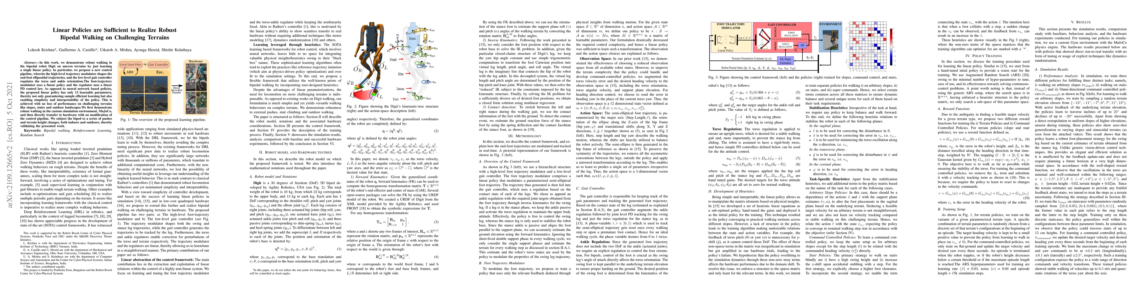 In this work, we demonstrate robust walking in the bipedal robot Digit on uneven terrains by just learning a single linear policy. In particular, we propose a new control pipeline, wherein the high-level trajectory modulator shapes the end-foot ellipsoidal trajectories, and the low-level gait controller regulates the torso and ankle orientation. The foot-trajectory modulator uses a linear policy and the regulator uses a linear PD control law. As opposed to neural network-based policies, the proposed linear policy has only 13 learnable parameters, thereby not only guaranteeing sample efficient learning but also enabling simplicity and interpretability of the policy. This is achieved with no loss of performance on challenging terrains like slopes, stairs and outdoor landscapes. We first demonstrate robust walking in the custom simulation environment, MuJoCo, and then directly transfer to hardware with no modification of the control pipeline. We subject the biped to a series of pushes and terrain height changes, both indoors and outdoors, thereby validating the presented work.